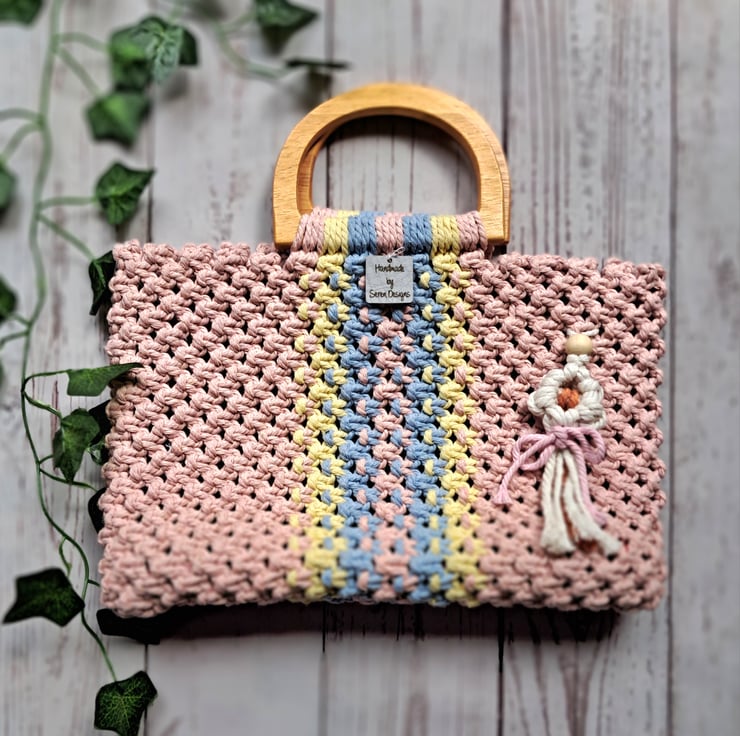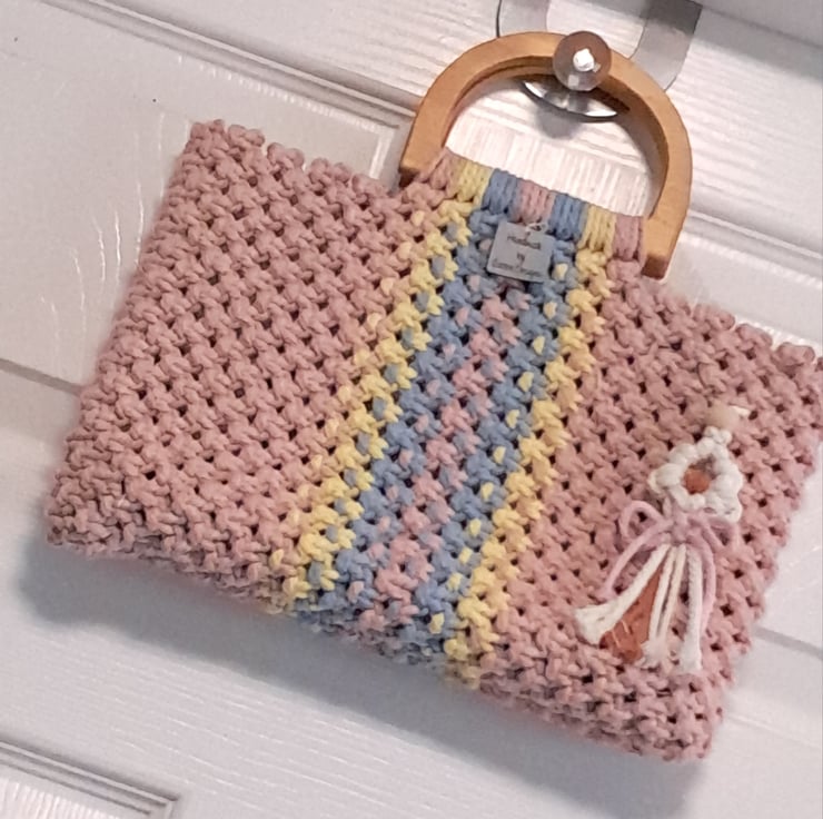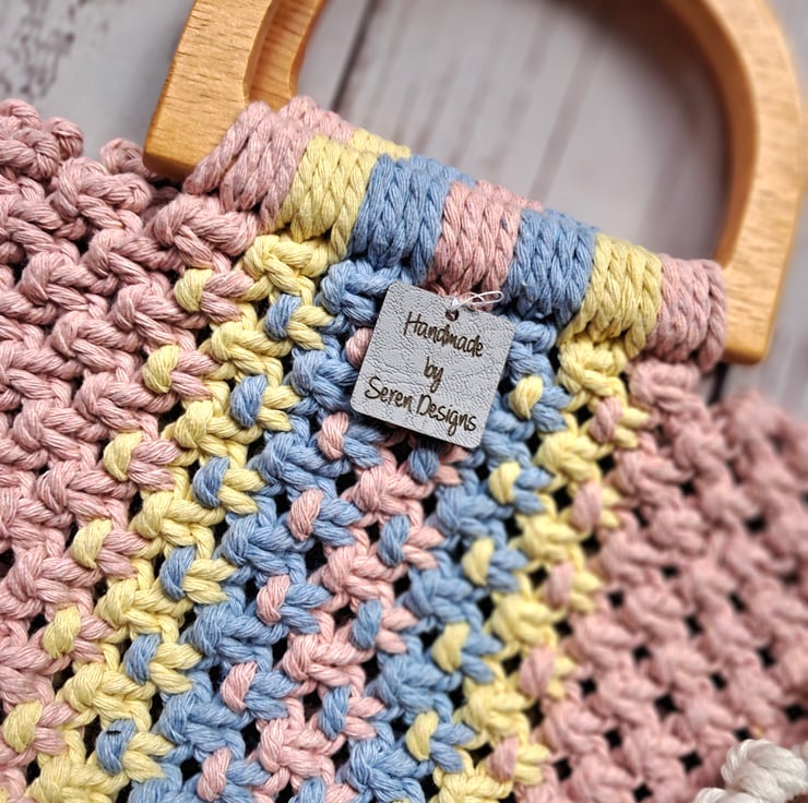 Made with macrame cotton in pastel shades of blue, pink and yellow with light brown wooden D shaped handles.
