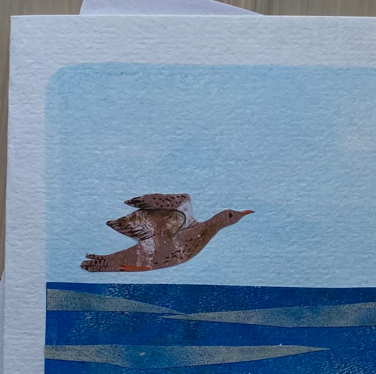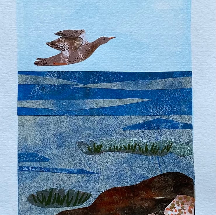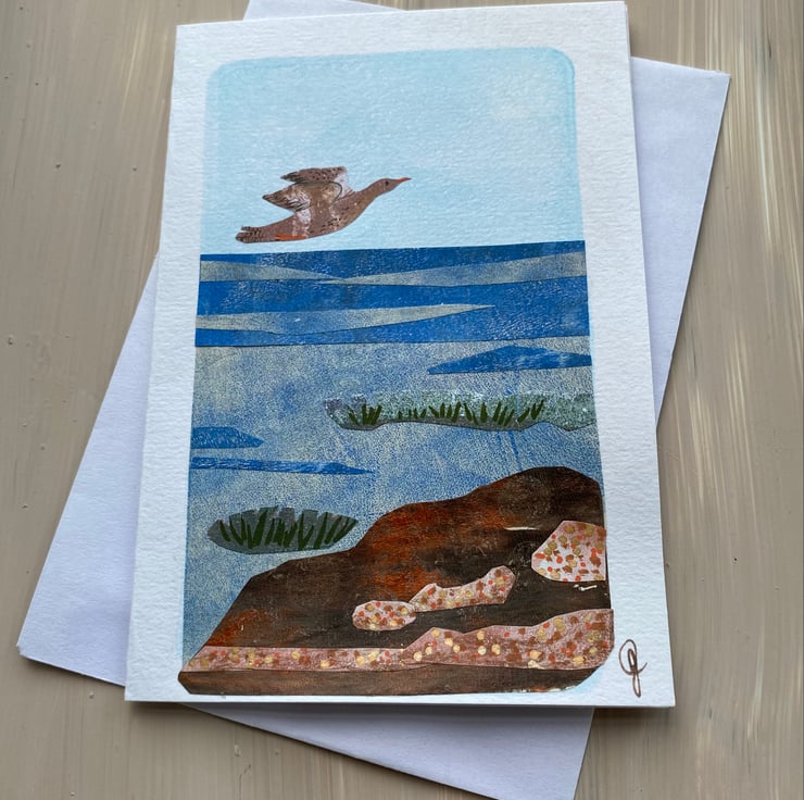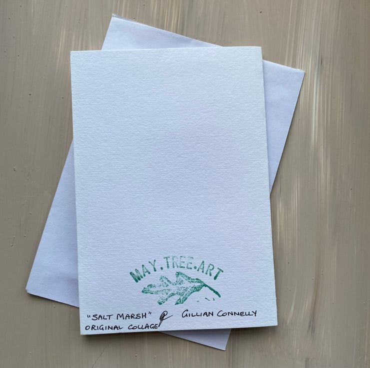This collage greetings card is assembled into this scene from a salt marsh, using my own hand printed papers.