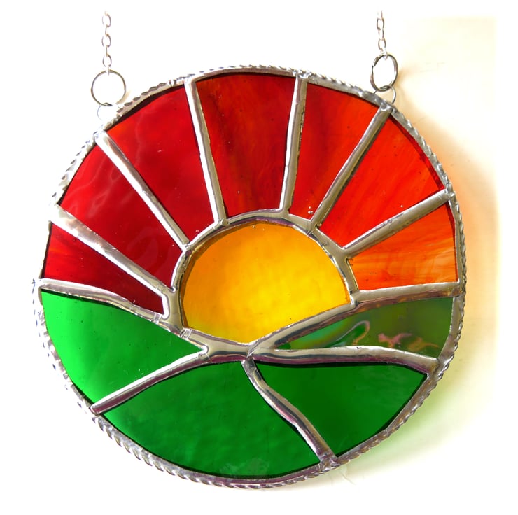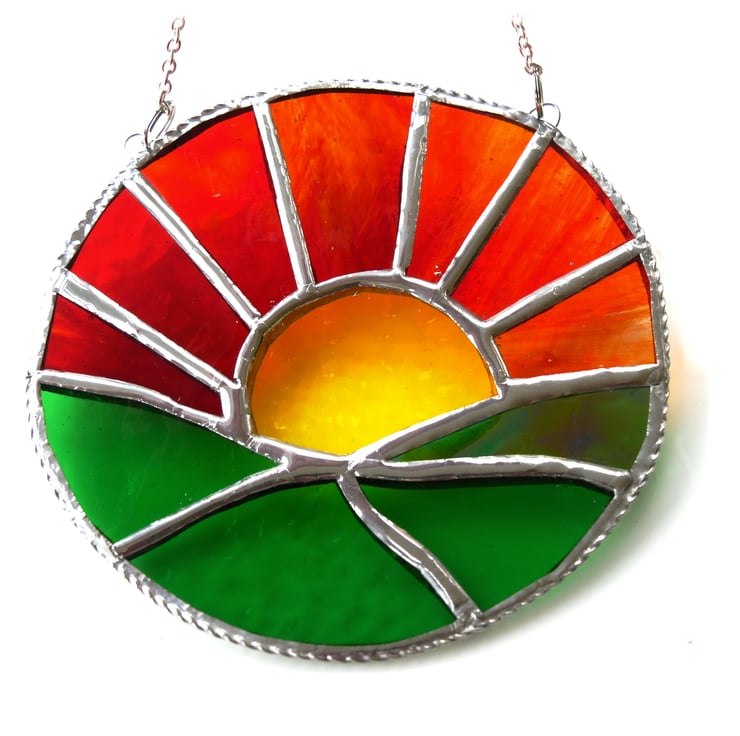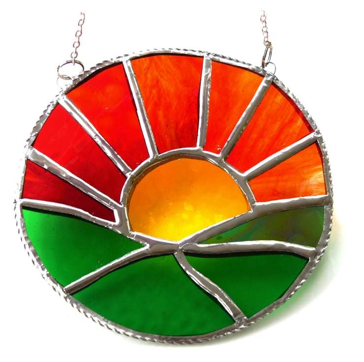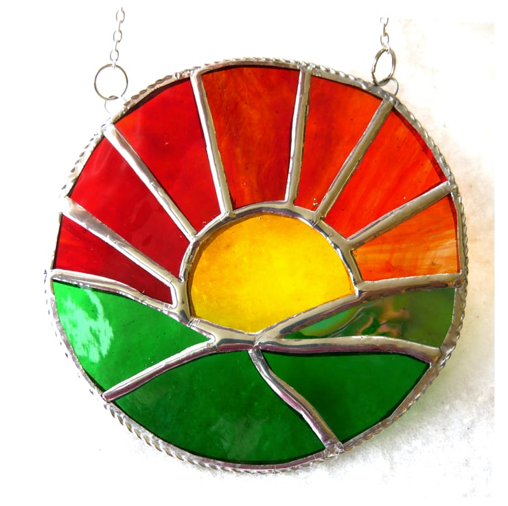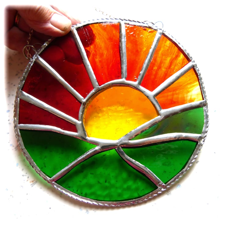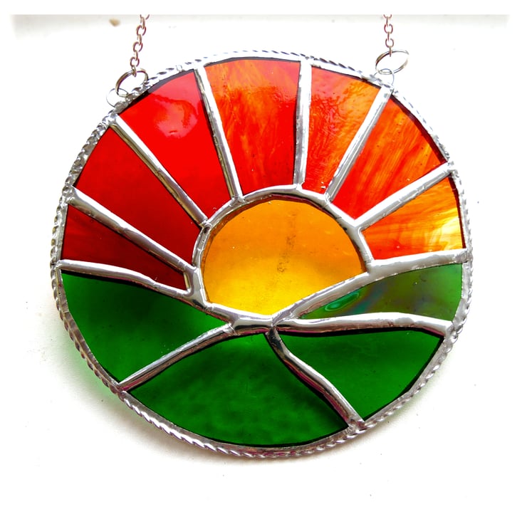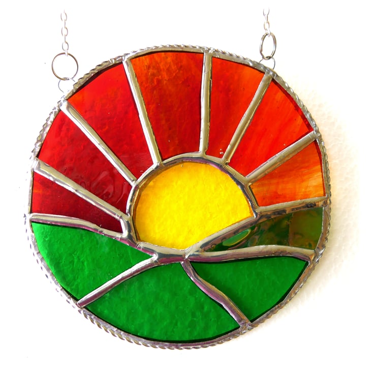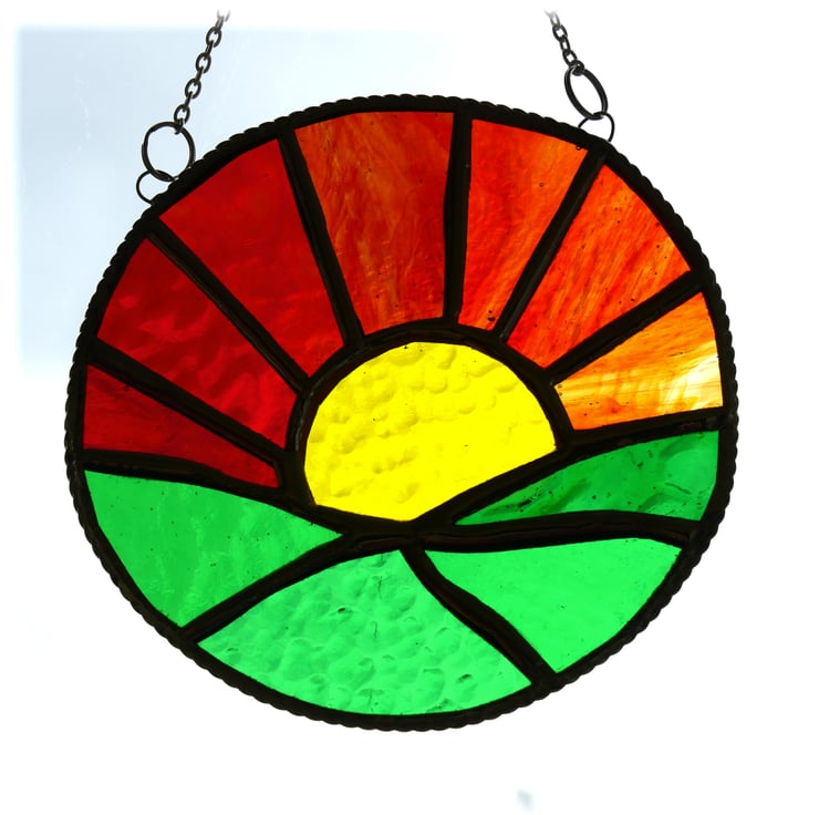 The sun is a bright circle of bright, yellow and the base of the suncatcher is formed from different greens of fields and hills.