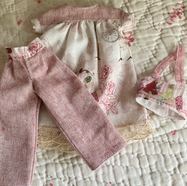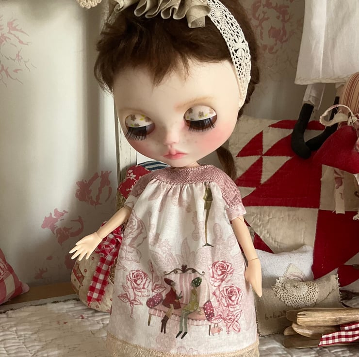 - a summer dress made from a pink Acufactum print, ‘Rose Kisses’, with a plain contrast. Trimmed antique lace on the hemline. Fastens with a popper at the back.