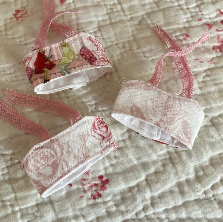 - a crop top with pink lace halter straps, which you tie loosely at the back. If this is too fiddly for you to tie, the straps can be positioned and attached to the back of the top with a few stitches. Fastens with two poppers at the back.
