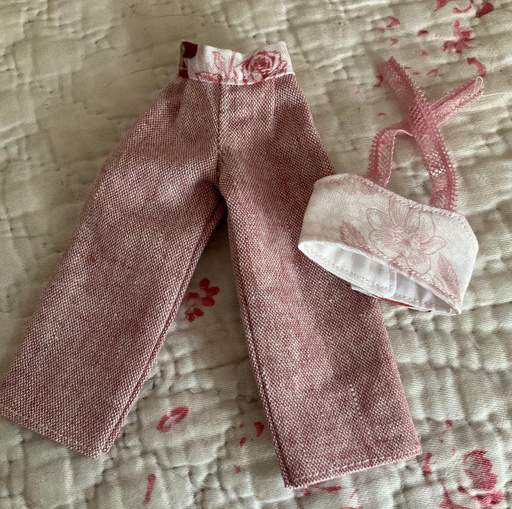 - a pair of wide pleated trousers, in a lovely dusky pink, by Acufactum - ‘Emma’, which is a cotton fabric, printed to look like linen. The contrasting waistband is in the same print as the dress. Fastens with a metal press stud at the back.