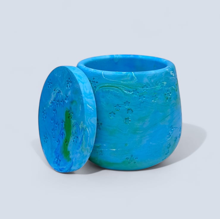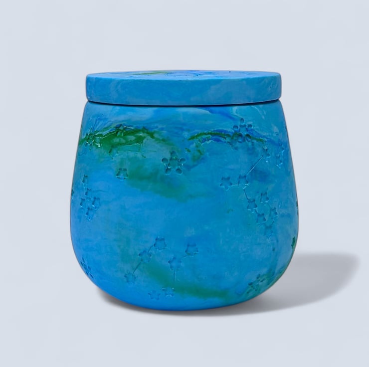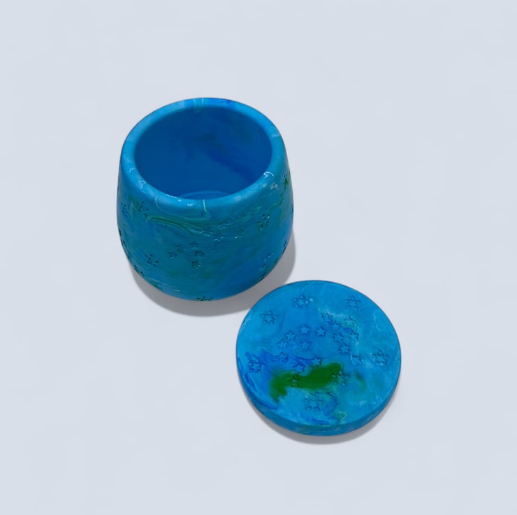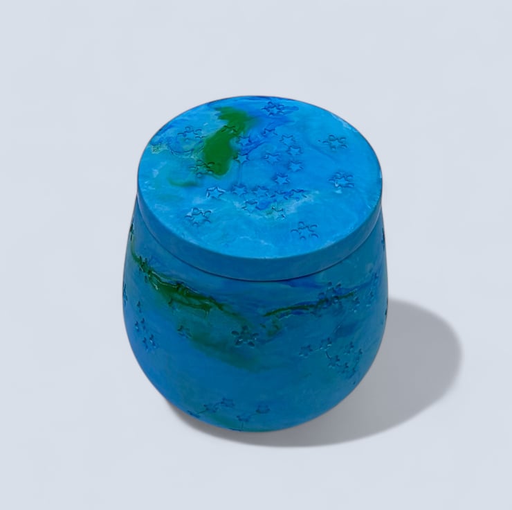 Inspired by the beauty of the sea, this green and blue jewellery box features a unique marbling pattern with shades of green, turquoise, and cyan swirling against a light blue background. Its bulbous design tapers towards the top and includes a matching lid that showcases the same marbling effect. The exterior and lid are adorned with a sunken star and constellation pattern.