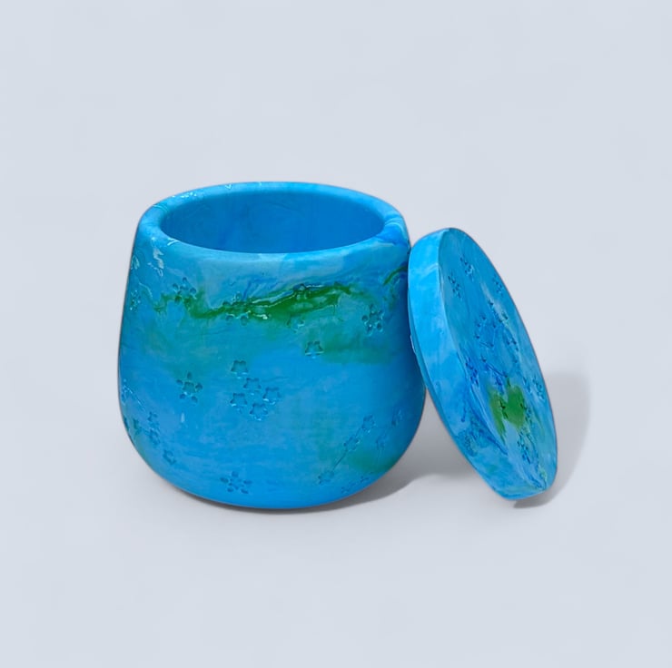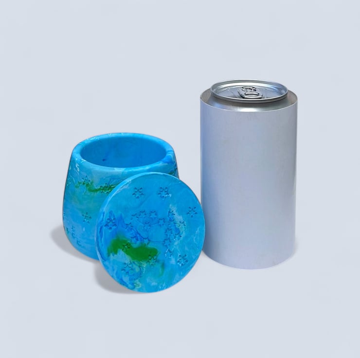 This trinket pot is crafted from Crystacast, giving it a dense, smooth, and luxurious finish similar to marble, with a satisfying weight. It is perfect for storing your keepsakes, trinkets, jewellery, or small treasures. It can also be used as a candle jar for tealights or small pillar candles, with the lid as a coaster to protect your surfaces from heat. The beautiful seascape marbling effect makes each trinket pot a unique piece of art, making it an ideal gift for a special person or a lovely treat for yourself.