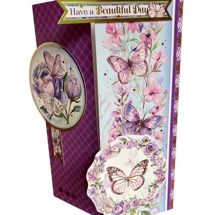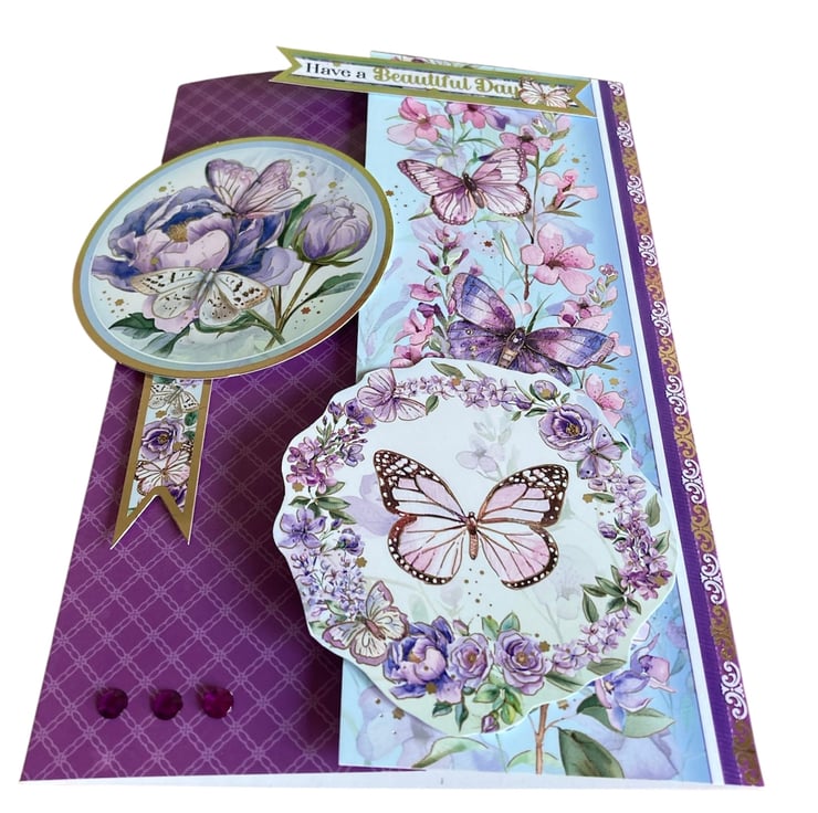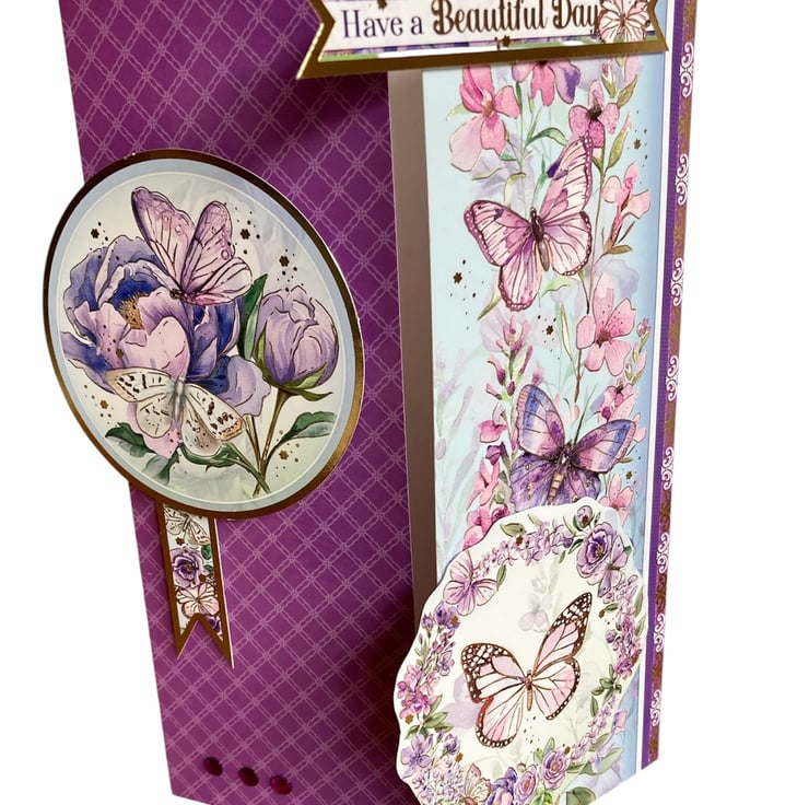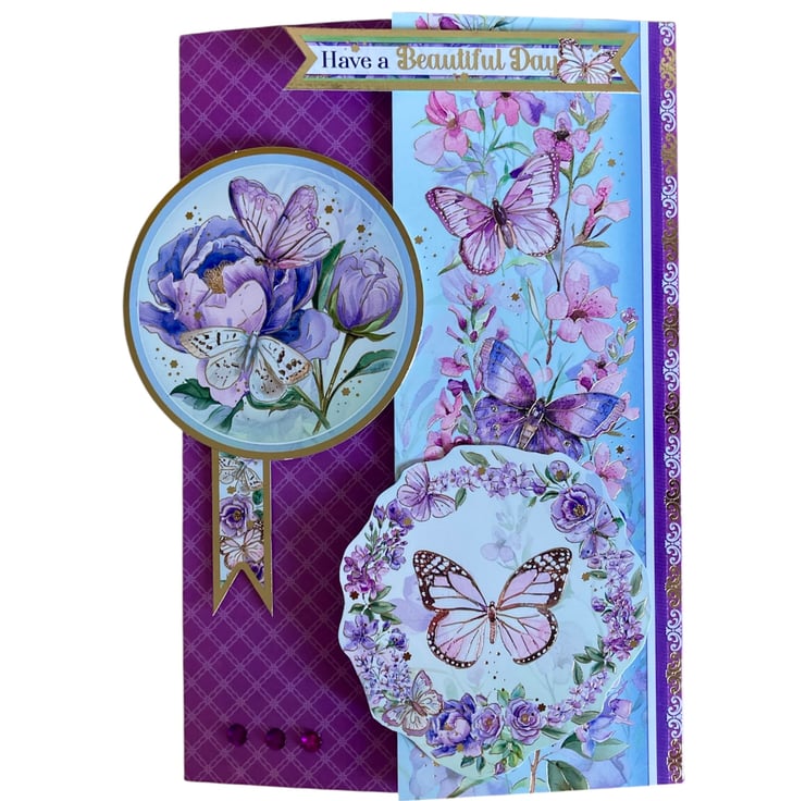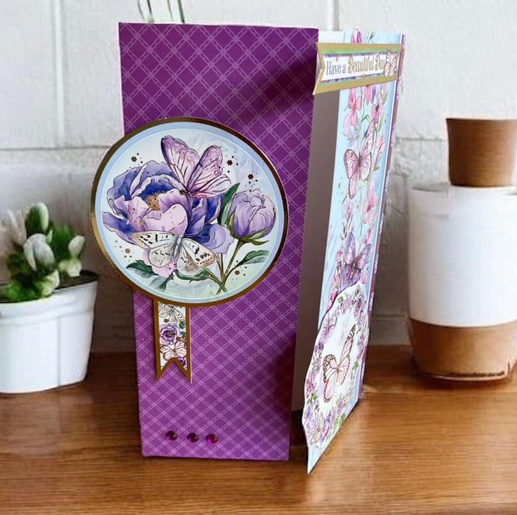 A pretty gatefold card featuring butterflies and peonies in purples and pinks perfect for wishing someone a happy birthday.