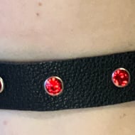 The Native American style design has a red stone centre has a screwback button and has been screwed onto the leather oval shape. There are also 2 Clear / White coloured Gemstones riveted onto the leather.