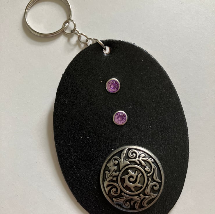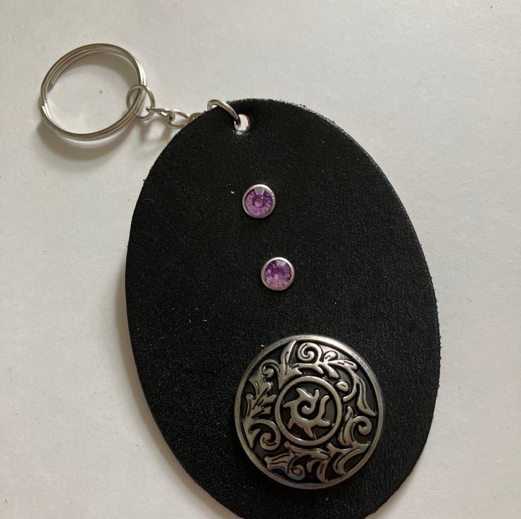 Black Leather Keyring with Floral Design and 2 Purple Gemstones
