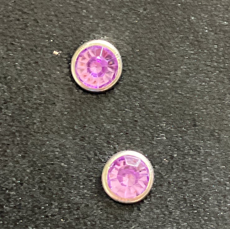 The Floral style design concho has a screwback button and has been screwed onto the leather oval shape. There are also 2 Purple coloured Gemstones riveted onto the leather.