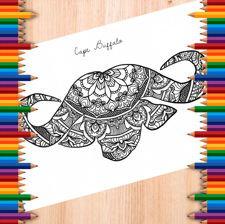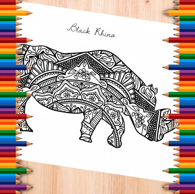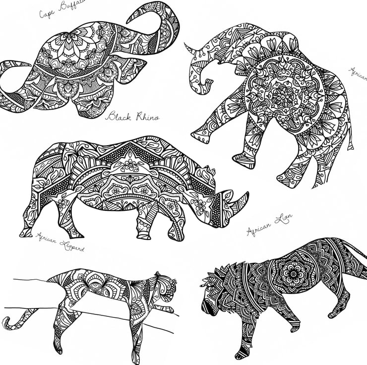 A digital, printable PDF of the African 'Big 5' animals filled with intricate mandala patterns in high resolution for colouring.