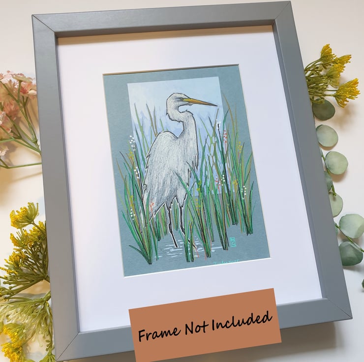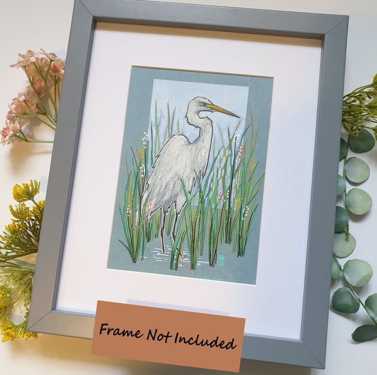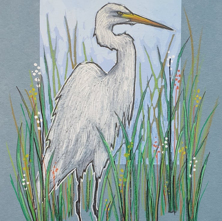 A small drawing of a Great White Egret bird standing in water with long grasses. A white heron like bird with black feet and legs and a yellow beak. The drawing is on light blue pastel paper.