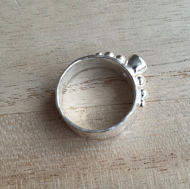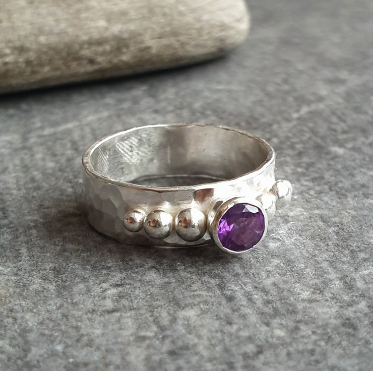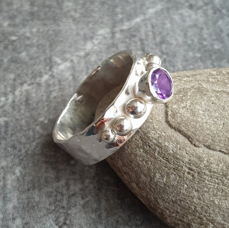 This stunning amethyst ring is made from sterling silver and features a sparkly deep purple amethyst sitting atop the hammered wide band ring. I've added three tiny melted silver balls to each side of the gemstone for extra detail and interest. The silver has a brightly polished finish which really makes the amethyst pop!