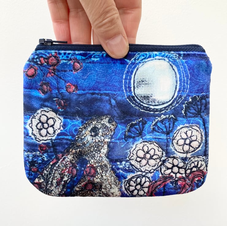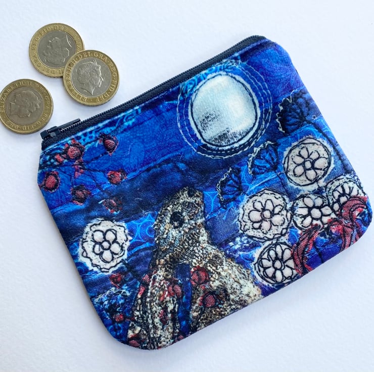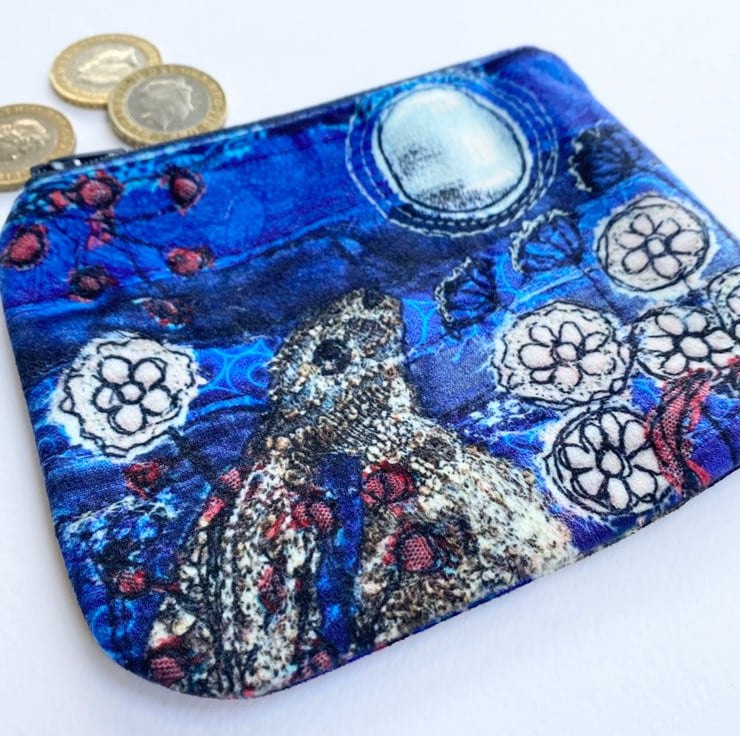 This highly versatile sweet zip bag is decorated with a print of one of my collage designs. This one has a cute little hare gazing at a full moon surrounded by flowers. It’s lined with a cotton lining and has various matching coloured zips. The print is on the front and back.