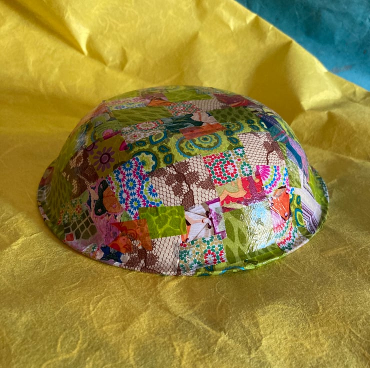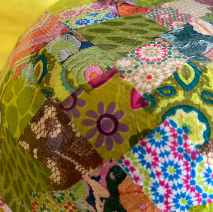 It has been covered in a variety of mainly green shades with a dabble of colour mixed in. It has then been varnished to give extra durability
