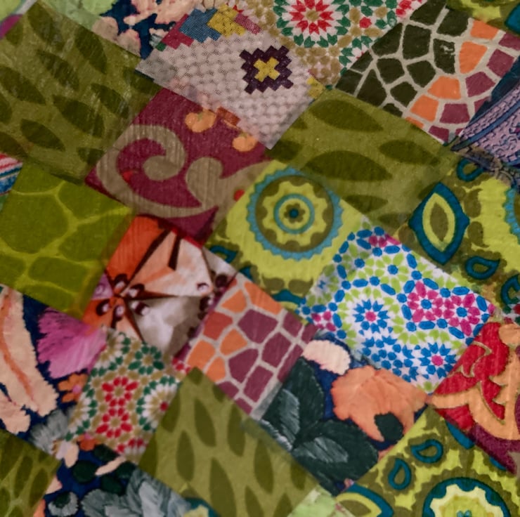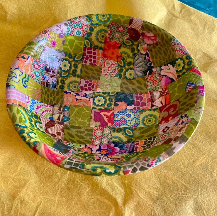 This round bamboo bowl has been cleaned and up cycled to its colourful and beautiful form.