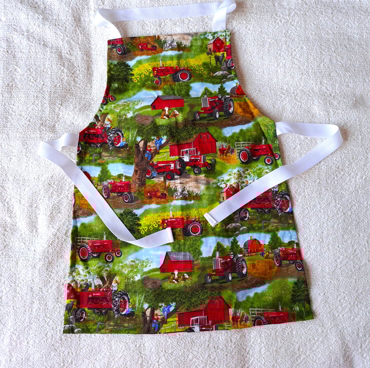 This lovely colourful apron has American farm scenes, depicting red tractors and children playing among the trees. It is 100% good quality cotton, with acrylic herringbone straps and can be machine washed. It is 22" (56 cm.) from neck to hem and 17" (43 cm.) at the widest point and fits a child of approximately six to ten years.