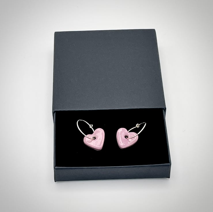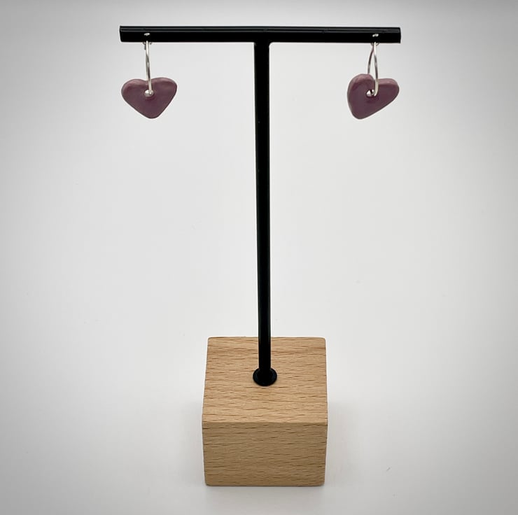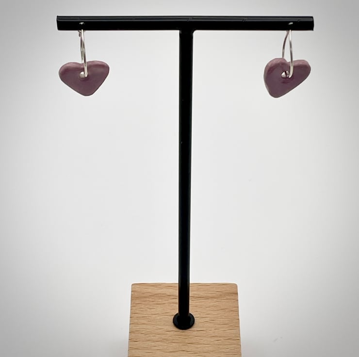 My handcrafted porcelain pastel purple sweetheart earrings are on sterling silver hoops. So light you won't know you're wearing them.