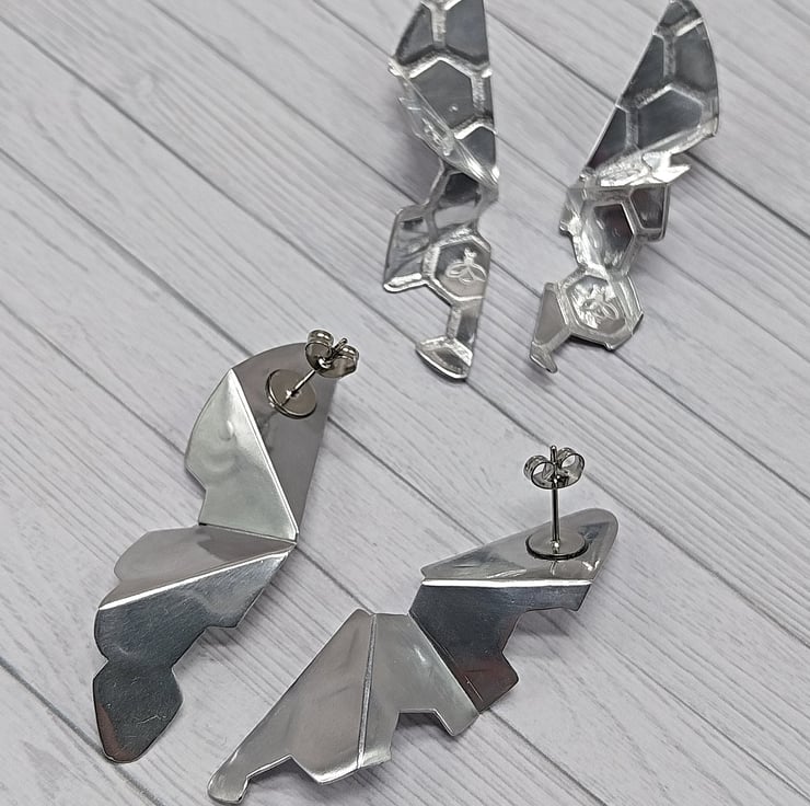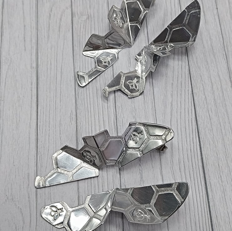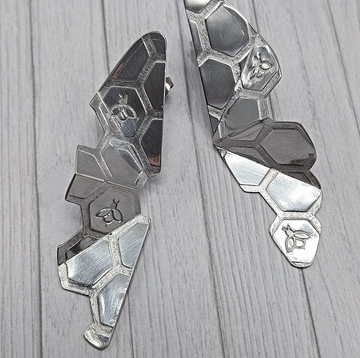 Handcrafted large stud earrings made from aluminium metal shaped into a half oval with an origami folded style design using a scoring technique. I have imprinted the metal with a honeycomb pattern using die cut card through a rolling mill, additionally adding a few little bees inside a few honeycomb sections using a metal punch. Each pair and singular earrings are unique and individual as I have cut away various small sections of the honeycomb design. Comfortable and light weight with a sustainable and eco-friendly material making these a perfect gift for her or yourself.