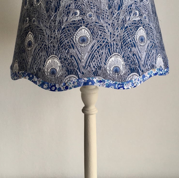 Such a delightful Peacock Print in different hues of Blue, finished with a Betsy Anne Liberty Trim, Lampshade looks simply lovely lit up.