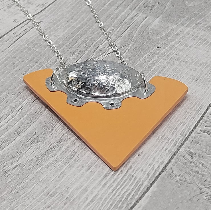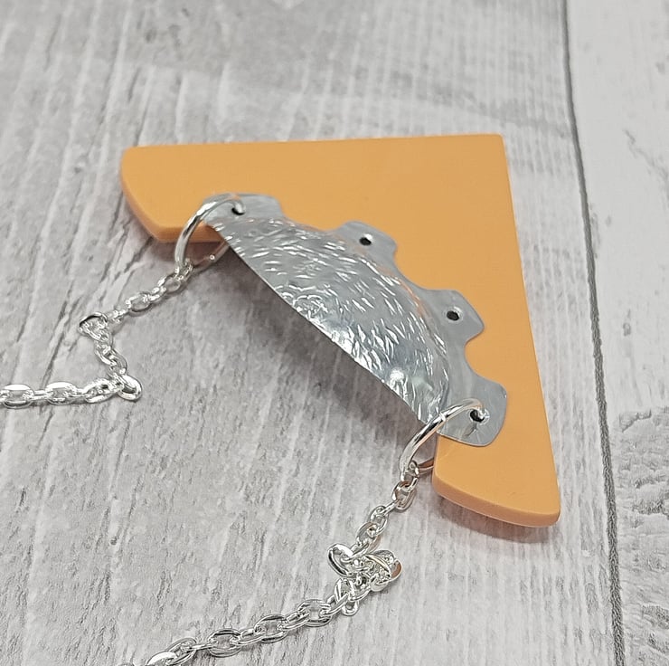 Handmade necklace made from recycled aluminium drink can complemented with the addition of an acrylic shape. The design focuses on the metal base of the can incorporating the domed shape which I have cut, shaped and hammered texture too giving this necklace it’s unique and one-of-a-kind individuality. The acrylic shape cut by hand in a triangular shape and delicate pastel peach colour; this is riveted to the metal using aluminium tubing. Eco-friendly material and lightweight and comfortable to wear for all occasions.