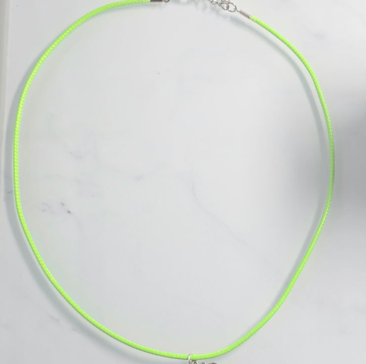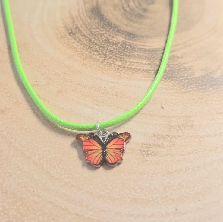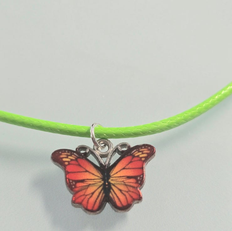 The necklace has been made using a lime green wax cord with an enamel orange butterfly charm in the centre.