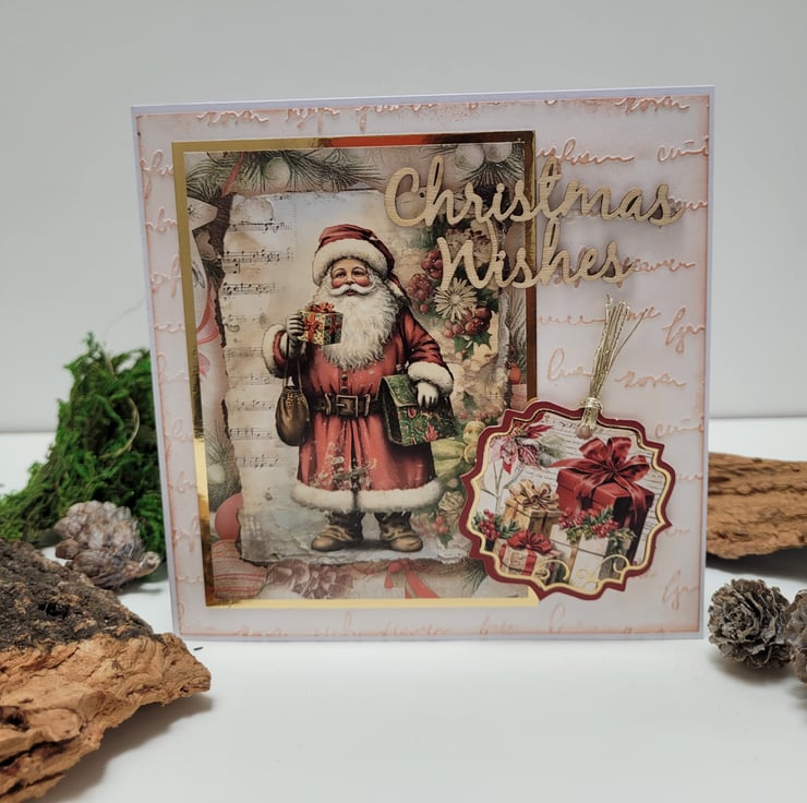 A lovely set of 4 handmade Christmas cards featuring traditional, 'olde worlde' imagery including a steam train, carol singers, poinsettias and of course, jolly old Santa Claus himself.
