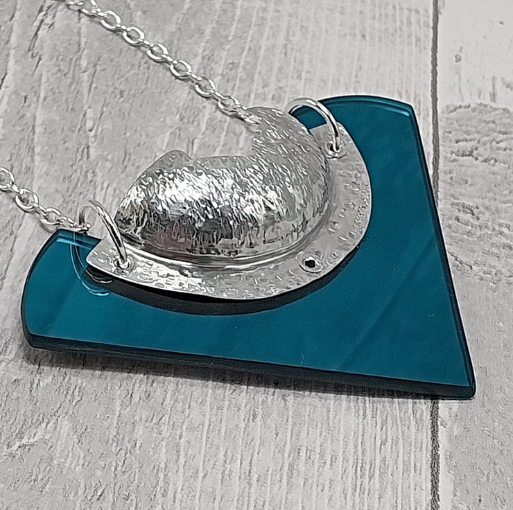 Handmade necklace made from recycled aluminium drink can complemented with the addition of an acrylic shape. The design focuses on the metal base of the can incorporating the domed shape which I have cut, shaped and hammered texture too giving this necklace it’s unique and one-of-a-kind individuality. The acrylic shape cut by hand in a curved triangle shape and bold mirrored teal colour; this is riveted to the metal using aluminium tubing. Eco-friendly material and lightweight and comfortable to wear for all occasions.