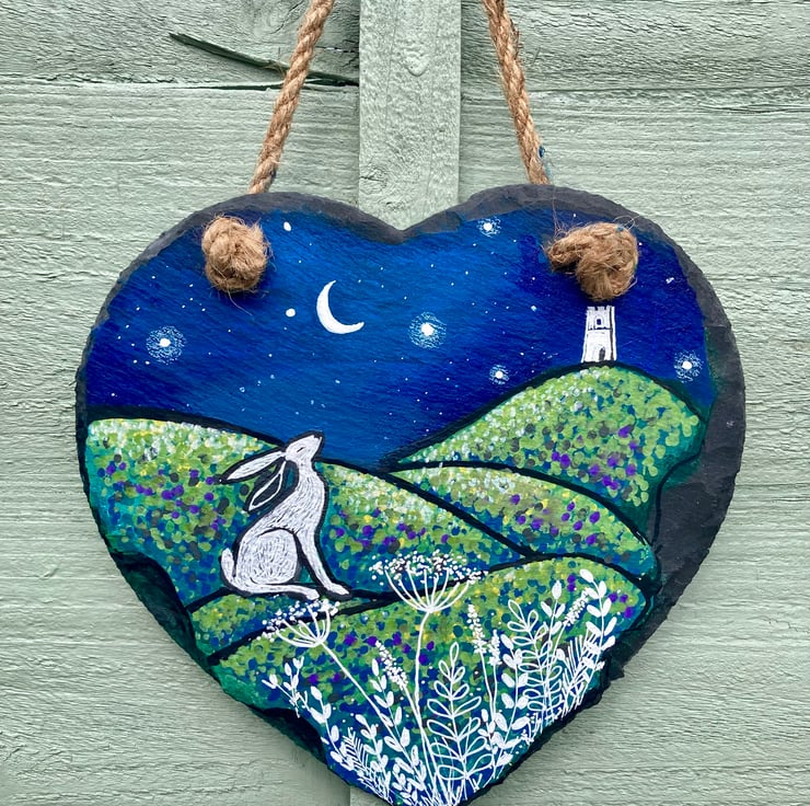White Moon Gazing Hare & Glastonbury Tor Painting On Large Slate Heart Hanging Decoration