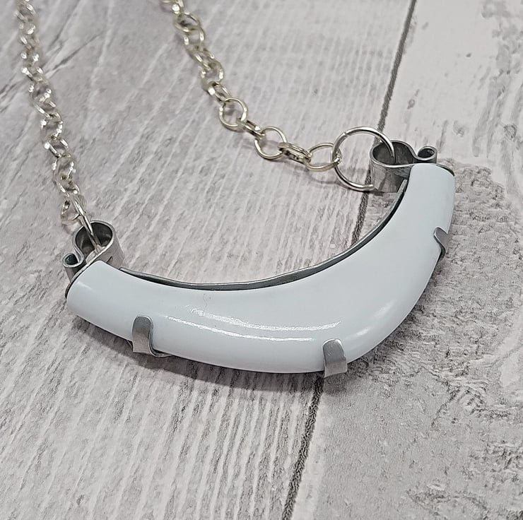 Pendant Necklace handcrafted from aluminium and recycled pre-loved jewellery, starting out as a white plastic bangle. Cutting this bangle into three sections I designed the aluminium shape to wrap around the pieces to create these unique and individual necklaces. Influenced by nature the design incorporates my love of cacti ad succulent plants giving this a natural organic feel. Materials are glued and riveted securely, to complete the necklace I used a chunky oval looped chain made from sterling silver. Light-weight and comfortable to wear with a unique and individual style, perfect gift or that little treat for your own collection.