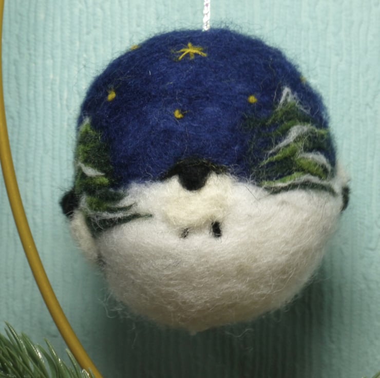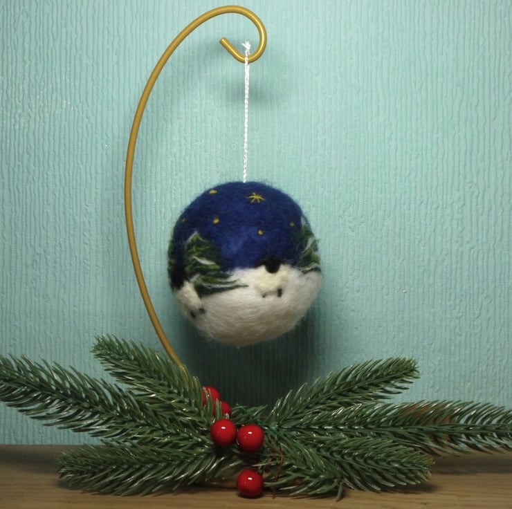 Handmade needle felted ornament decorated with a winter night scene with trees and sheep that comes with the gold decorative stand as in the photo. The ornament is made from 100% core wool that we then decorated with a mix of natural and dyed wools and fibres. Each design is a unique one off design due to the nature of the fibres and wools used. A pretty, festive decorative item for any home.