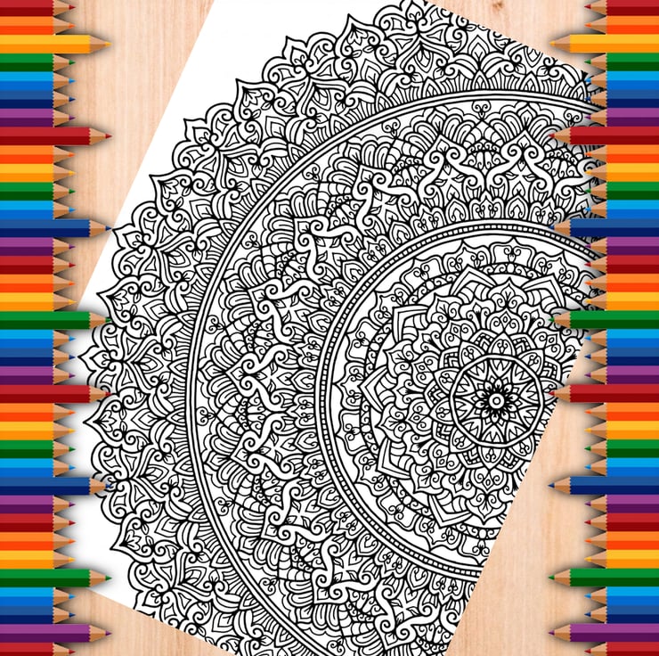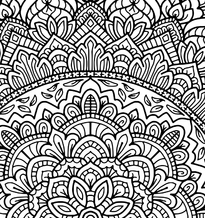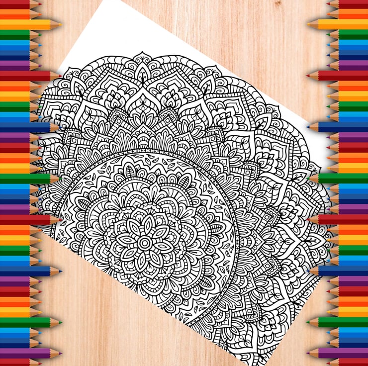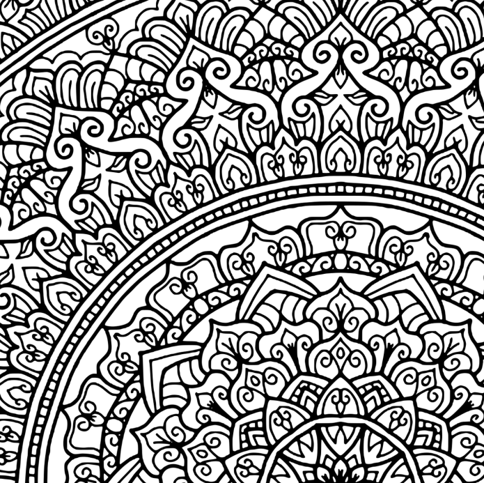 A digital, printable PDF of two large, high detail mandalas that spread off the page, one per page, in high resolution for colouring.