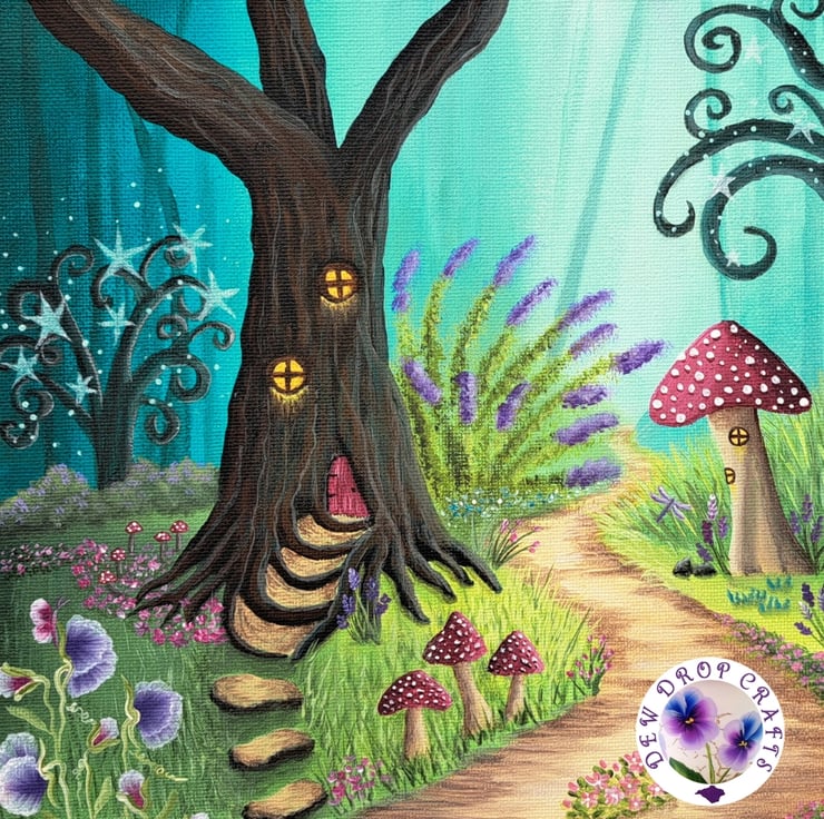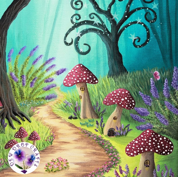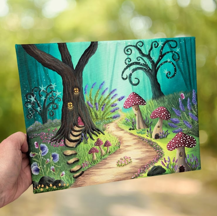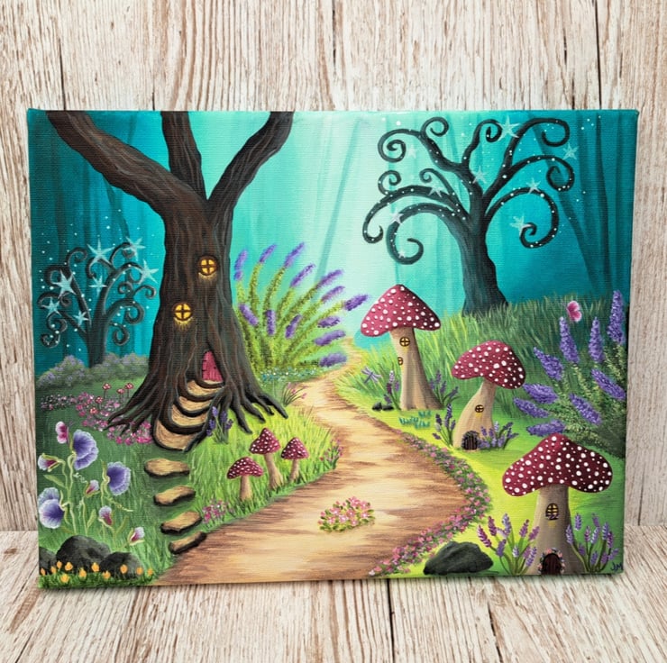 This is an original acrylic painting on canvas, depicting a magical scene with toadstool houses, mushrooms, flowers and magical trees in a fantasy woodland setting.