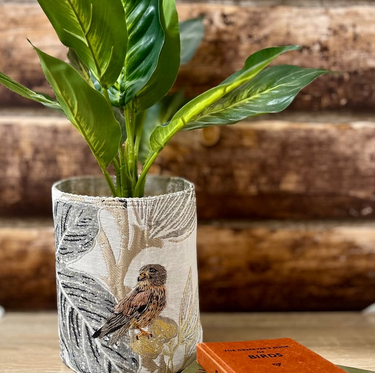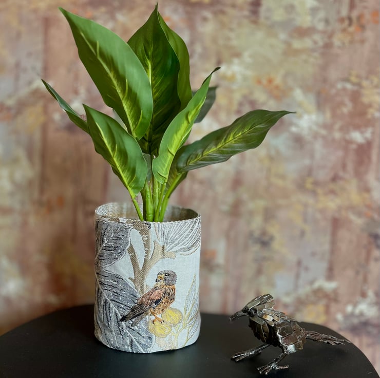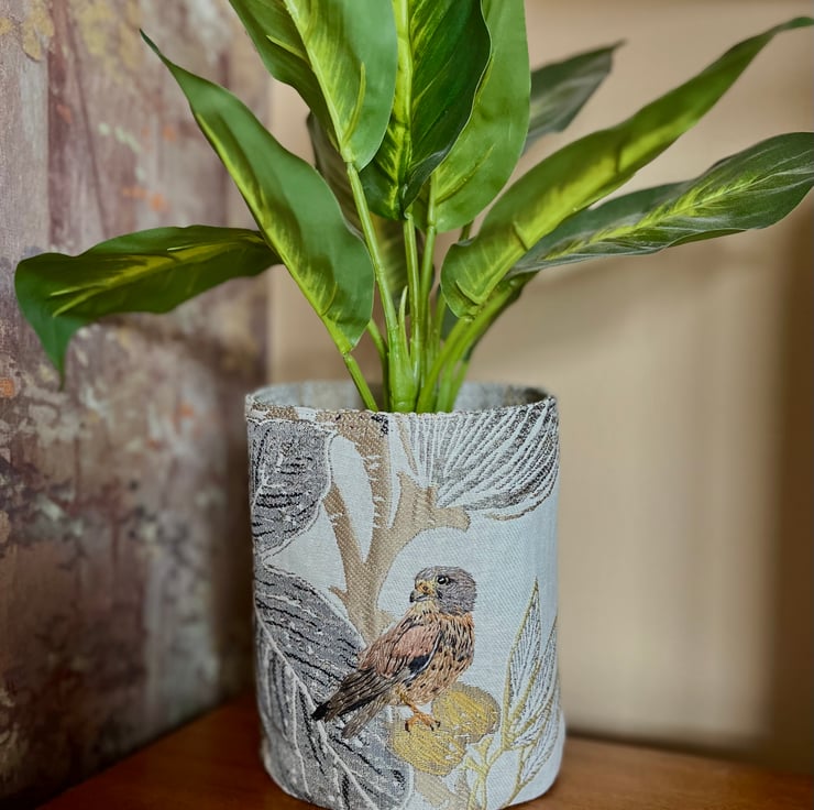 This particular storage pot is made from an offcut of a curtain sample of a light grey/cream background with large grey leaves, gold leaves and biscuit stems.