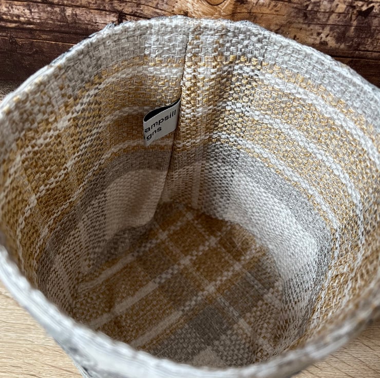 The pot has been interlined with an iron-on interfacing and lined in a check fabric of grey, gold and cream which was also a curtain sample.