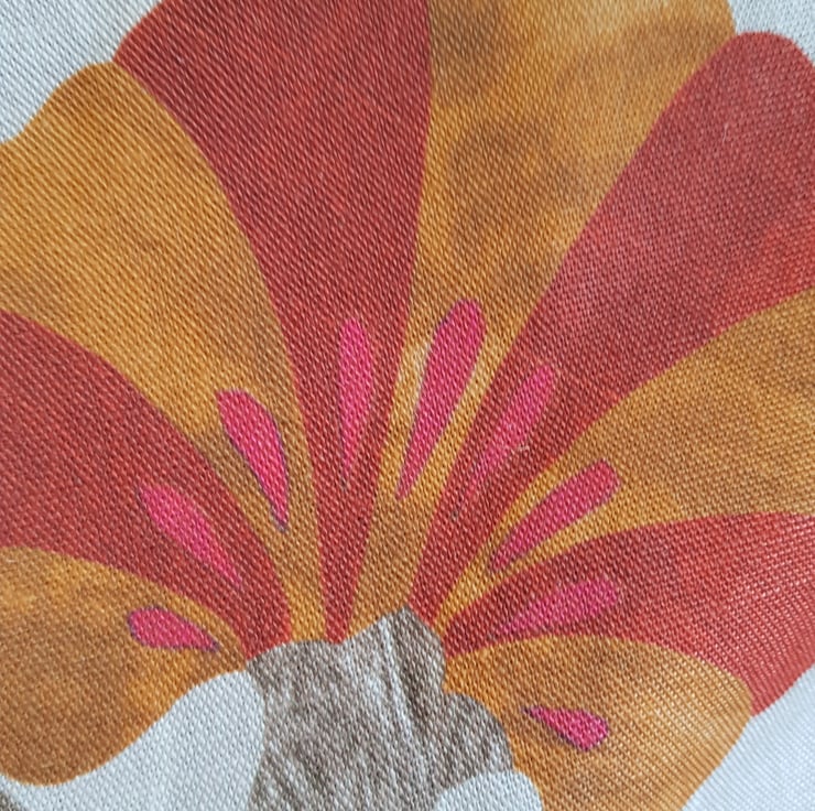 The front fabric is a remnant of a floral furnishing fabric the back is denim from repurposed Jean's. The purse is lined with an orange print cotton.