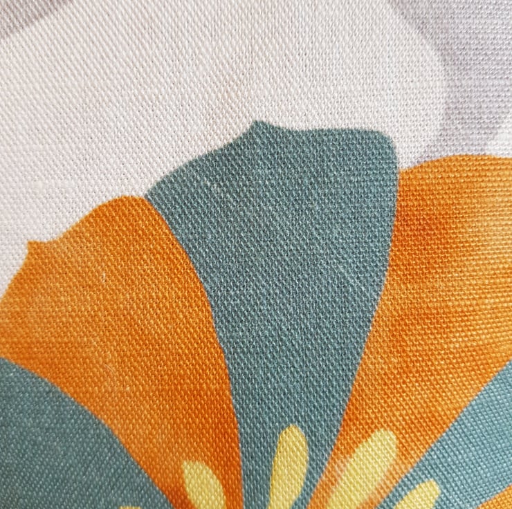 The front fabric is a remnant of a floral furnishing fabric the back is denim from repurposed Jean's. The purse is lined with an orange print cotton.