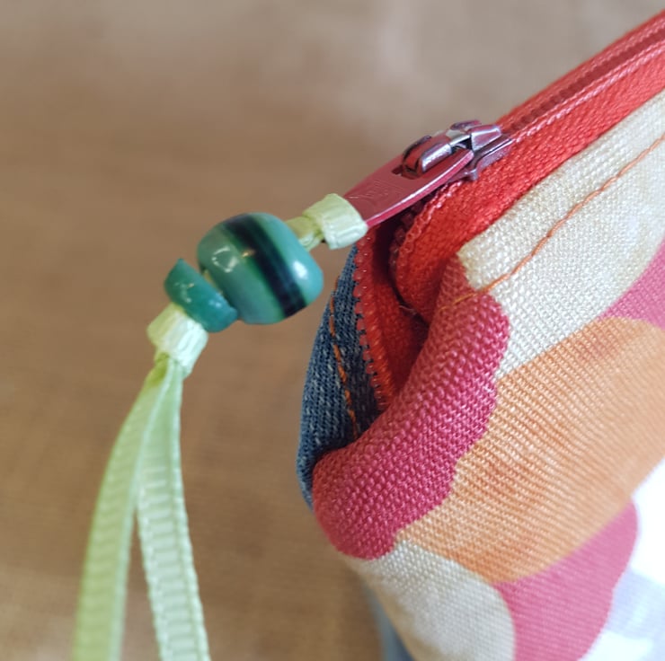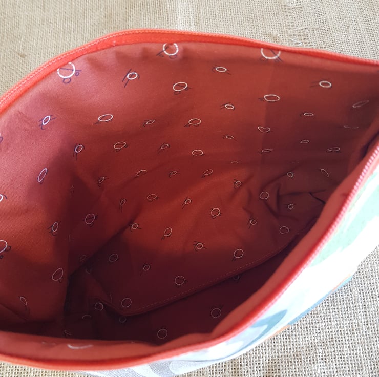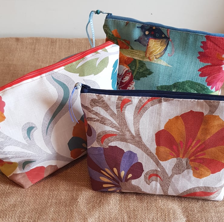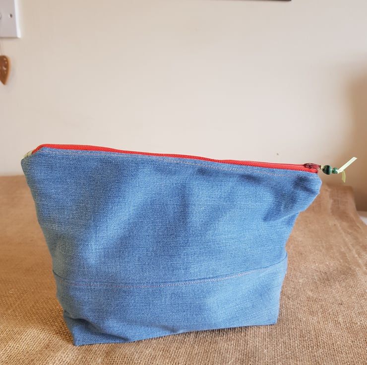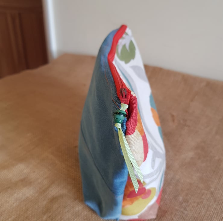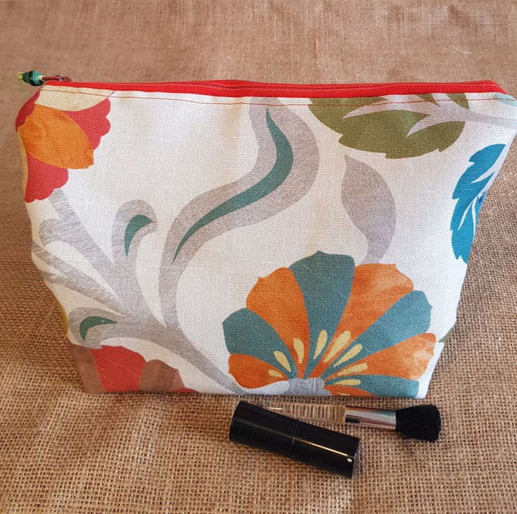 This larger pouch/ makeup bag is made from remnants of curtain fabric. It would be ideal to pop in a small gift. It is large enough for a paperback book too.