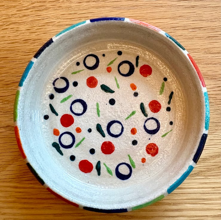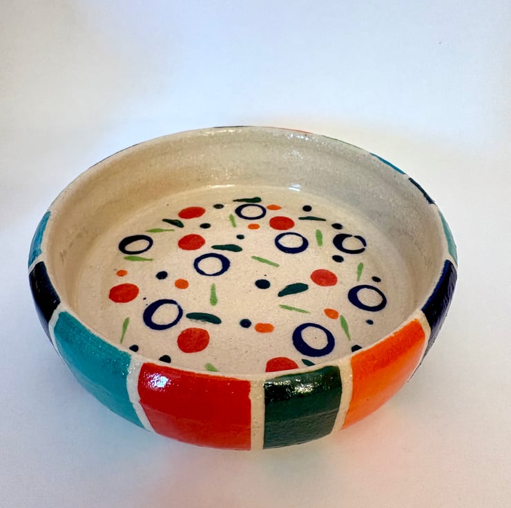 I like throwing these little dishes and coming up with different designs to decorate them. This design in red, orange, turquoise, lime and cobalt blue has been hand painted with underglazes and then finished with a clear shiny glaze to make it waterproof. These dishes are oven and dishwasher proof. The dish measures 11cm in diameter and is about 3cm deep-great for small treats and nibbles!