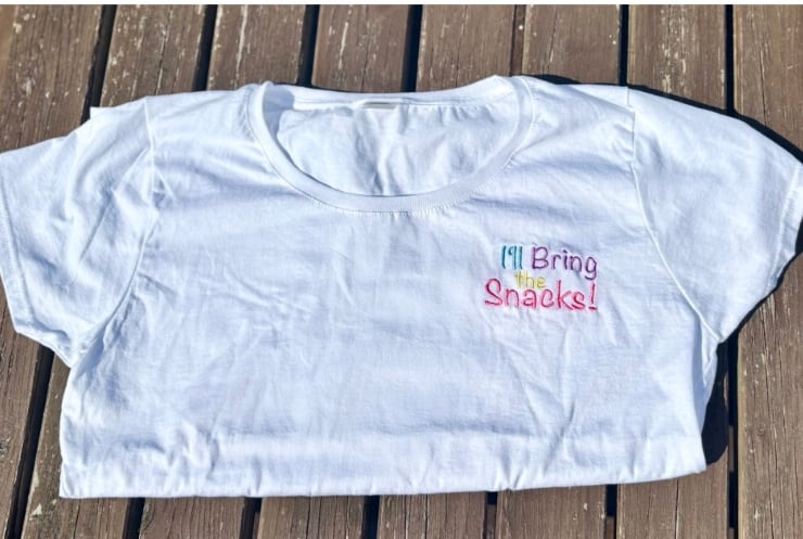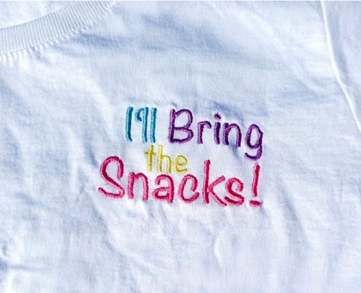 “I’ll bring the snacks” embroidered on the left chest of a white T-shirt. A fun colourful t-shirt for the summer. I’m always the one who has a supply of snacks, can’t go anywhere without a bag of crisps, biscuits or sweets! So if you’re the same this T-shirt is for you! If you’d like any changes please get in touch and I’ll do my best to make it.