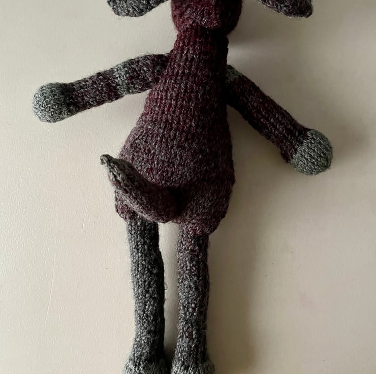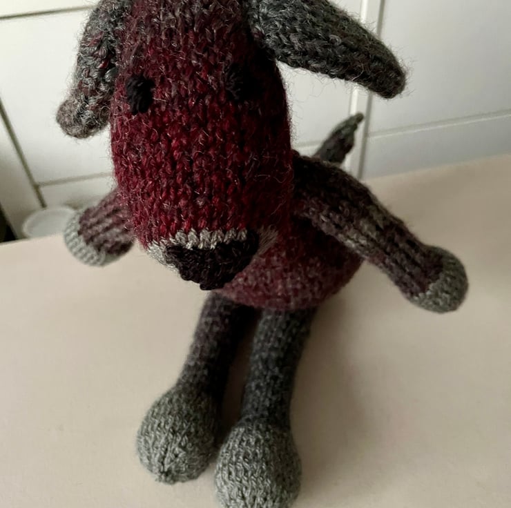 Dog is hand knitted from grey and burgundy chunky knitting wool and is filled with soft toy filling which complies to BS1425, BS5852 and EN71 standards. The eye and claw details are hand embroidered with black double knitting wool. (matches listing of unisex cardigan with toggles)