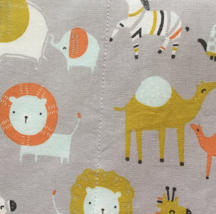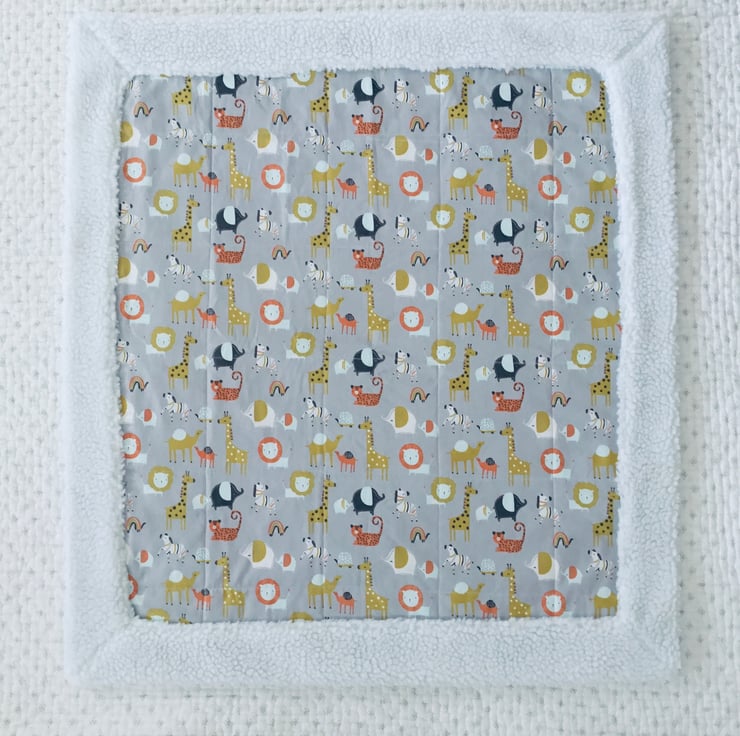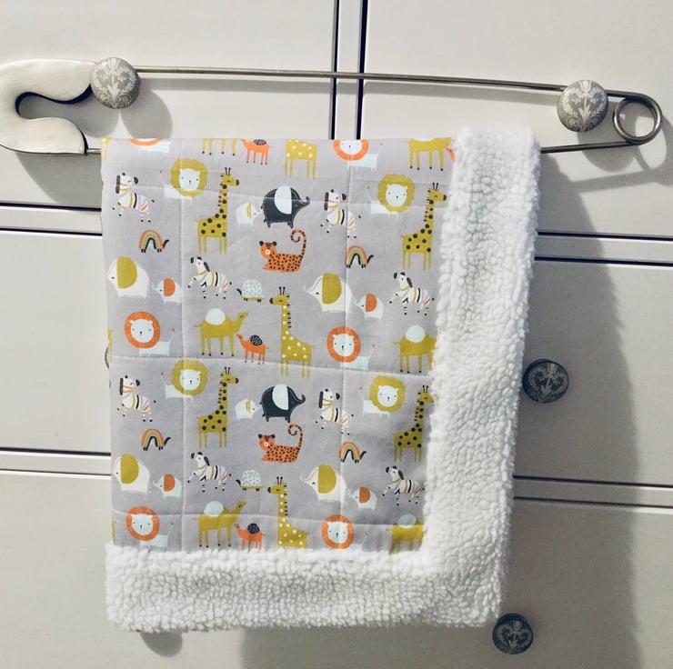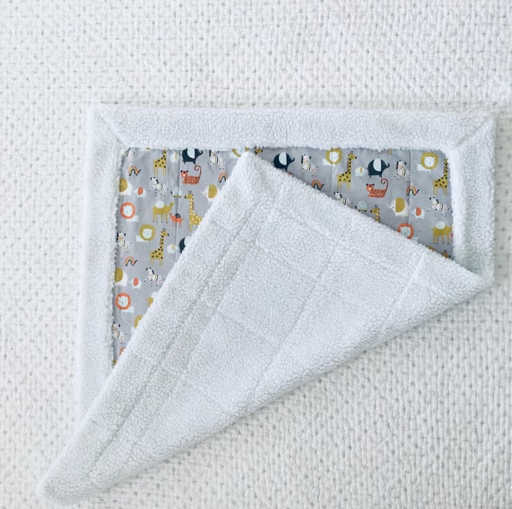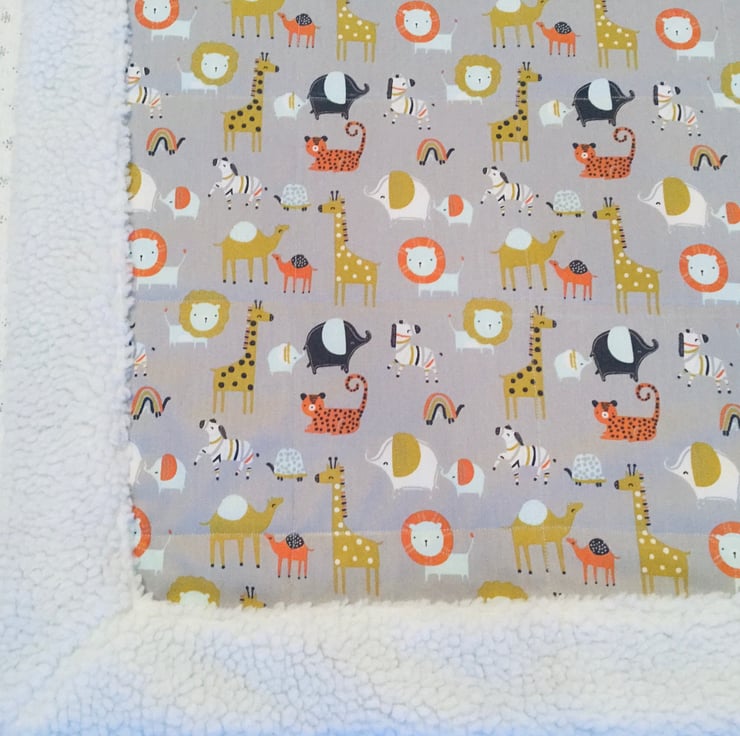 Snuggly baby blanket made from an organic cotton featuring animals on an grey background and backed with a faux shearling fleece. Ideal for a pram or buggy blanket or cuddle time with baby, the blanket measures 68cm wide x 75cm long. Machine washable at 30o