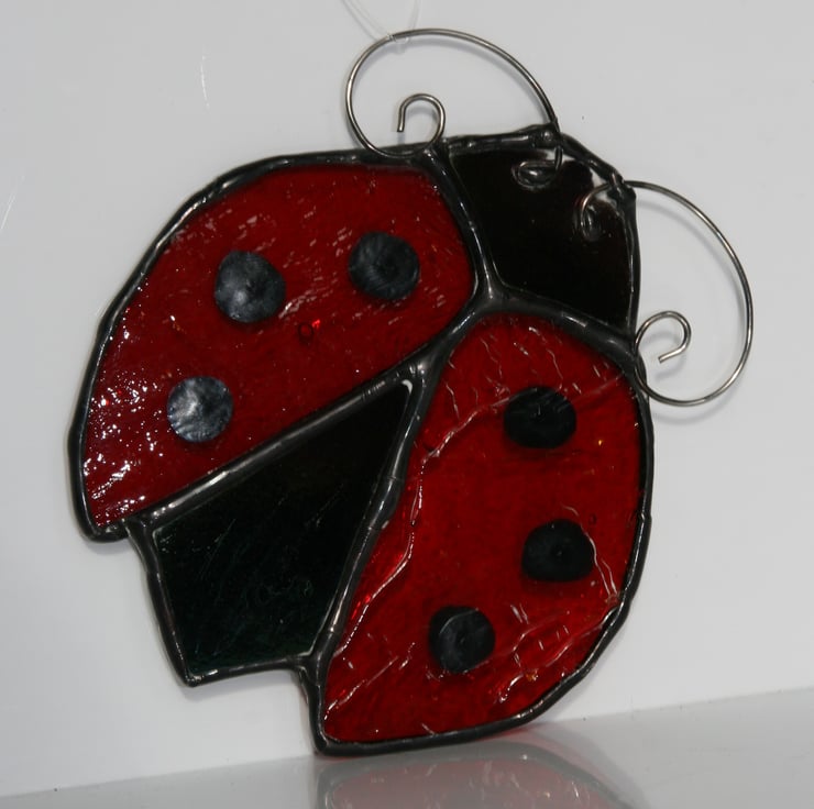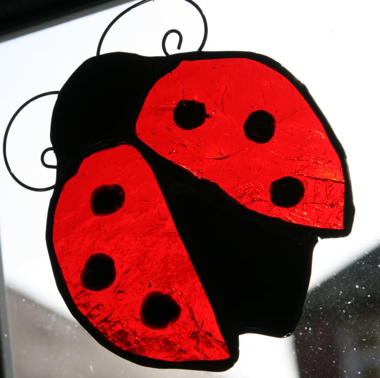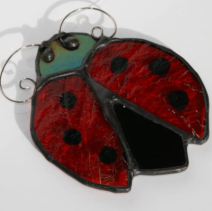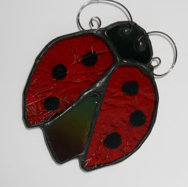 Everyone loves a ladybird. It holds a fascination which delights people young and old and those in the middle too. A handmade stained glass ladybird makes the perfect gift and can be hung in a sunny window to see the full beauty of the glass. The head and centre body is made from iridescent glass and reflect some beautiful colours.