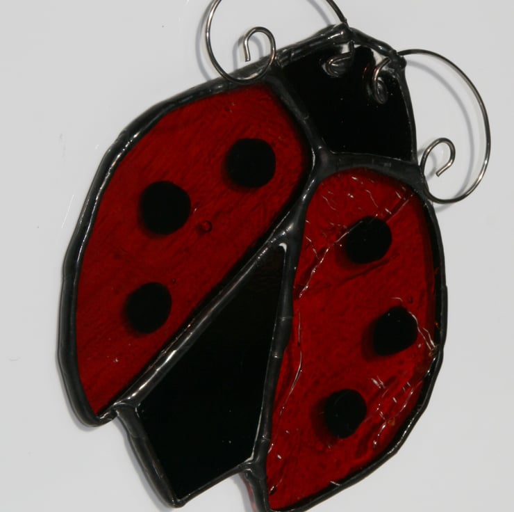 Made using the copper foil method, each piece of glass is hand cut and grinded to shape. The spots are painted on and then baked at high temperature to fix. Then each piece is wrapped in copper foil before soldering together. The wire work is created and soldered in place and finally the complete ladybirds are washed, waxed and polished.