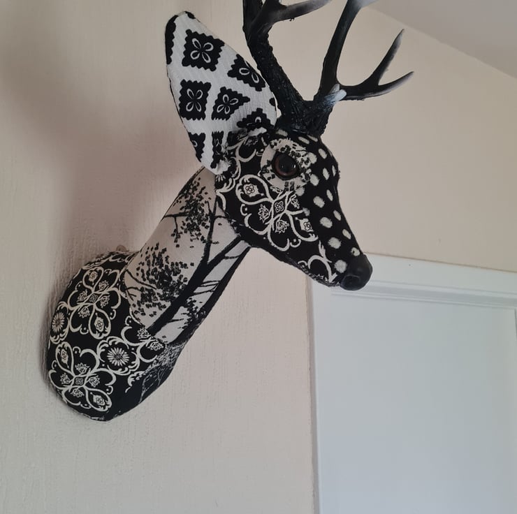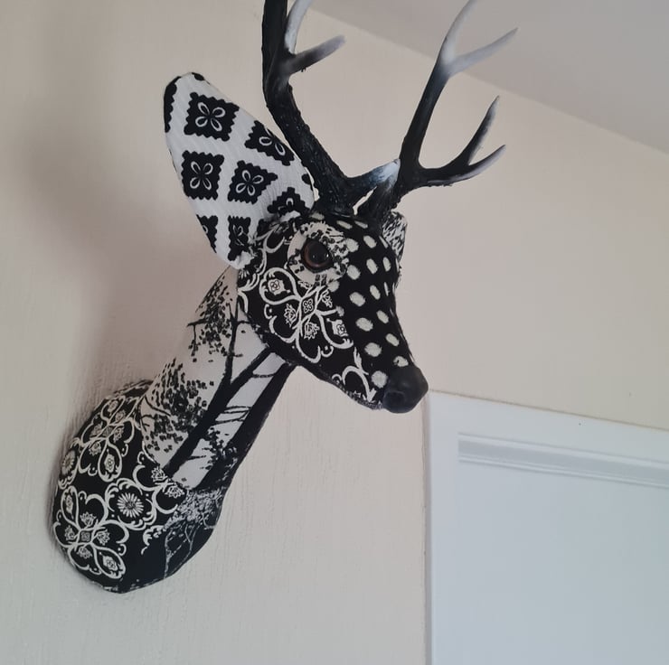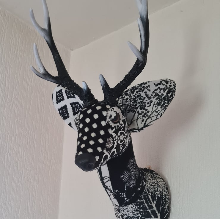 A lifesize faux deer head which I have handmade in a patchwork of different black and white patterned fabrics. He has faux antlers which have been hand textured and sprayed. The head is backed with felt and has a metal hanger to hang it on the wall. It is lightweight.