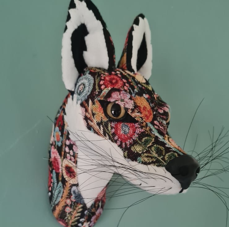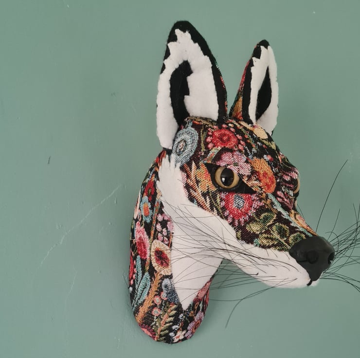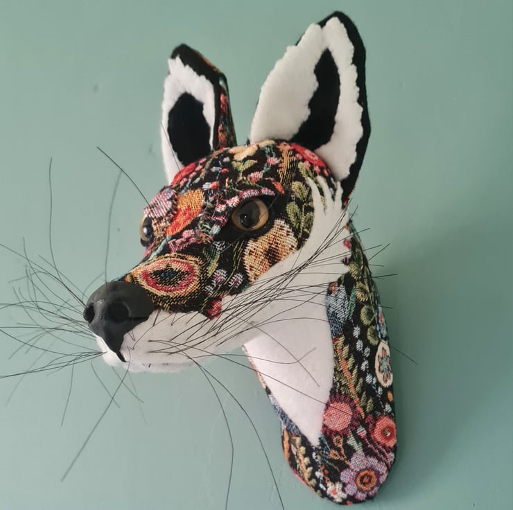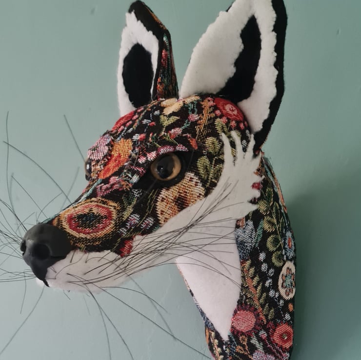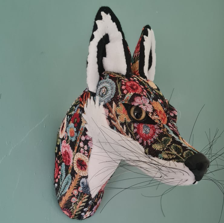 A lifesize faux fox head which I have handmade and covered in hand stitched floral tapestry fabric. The nose is handmade from polymer clay. The head is backed with felt and has a metal hanger to hang it on the wall. It is lightweight.