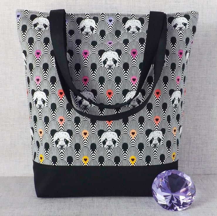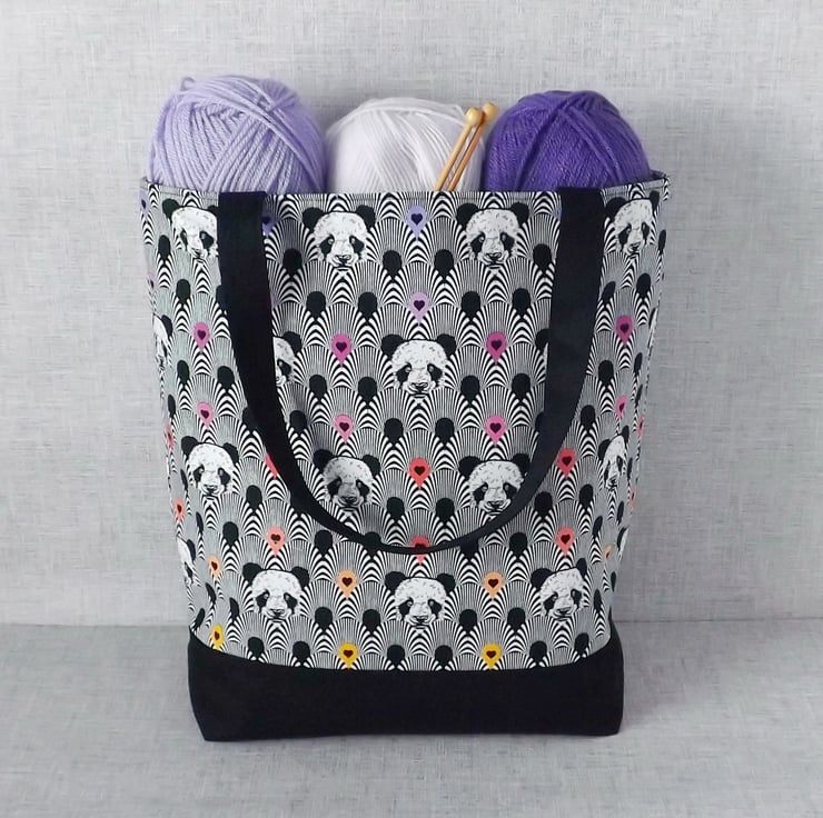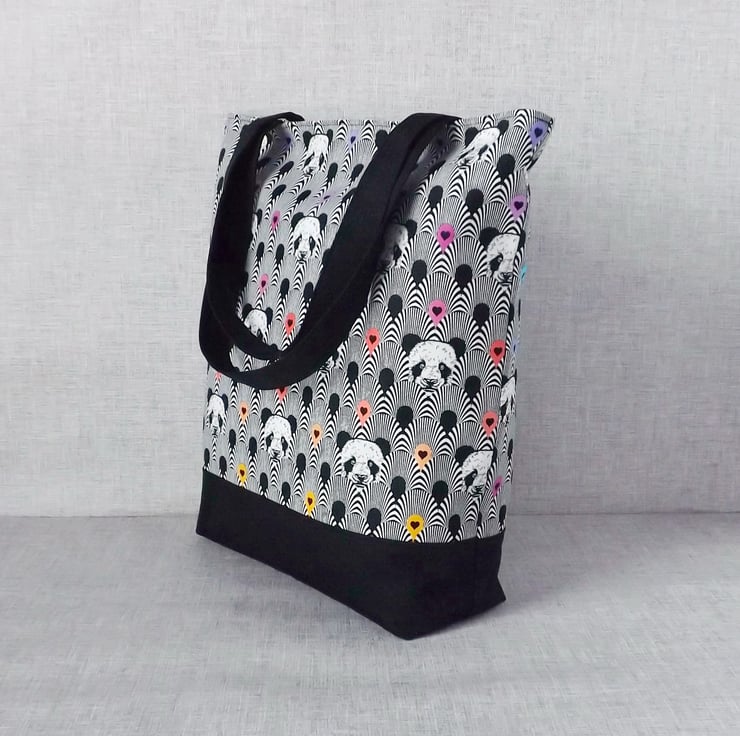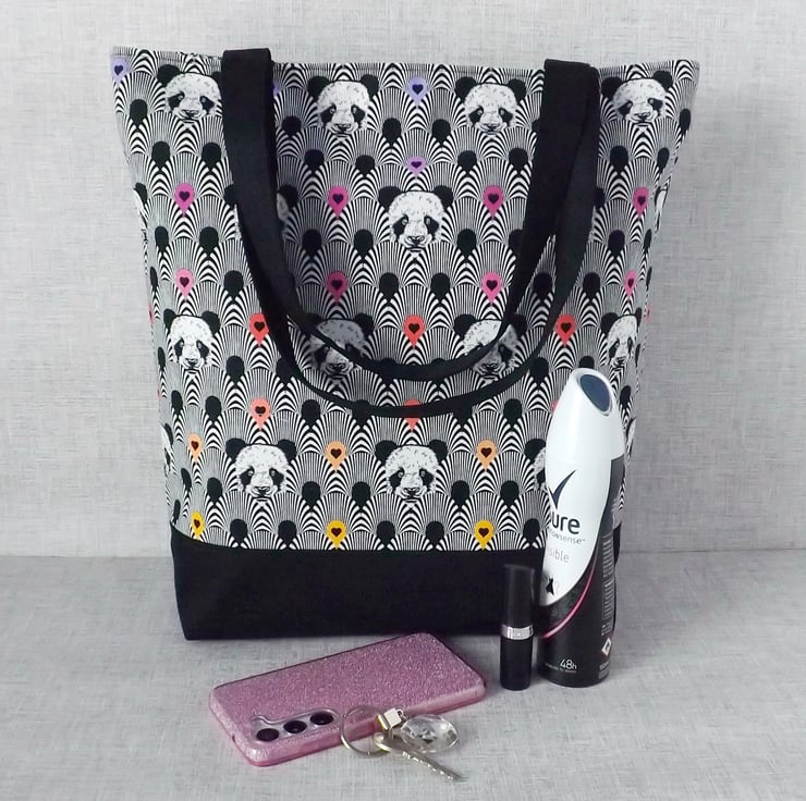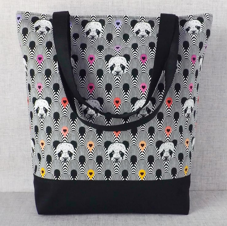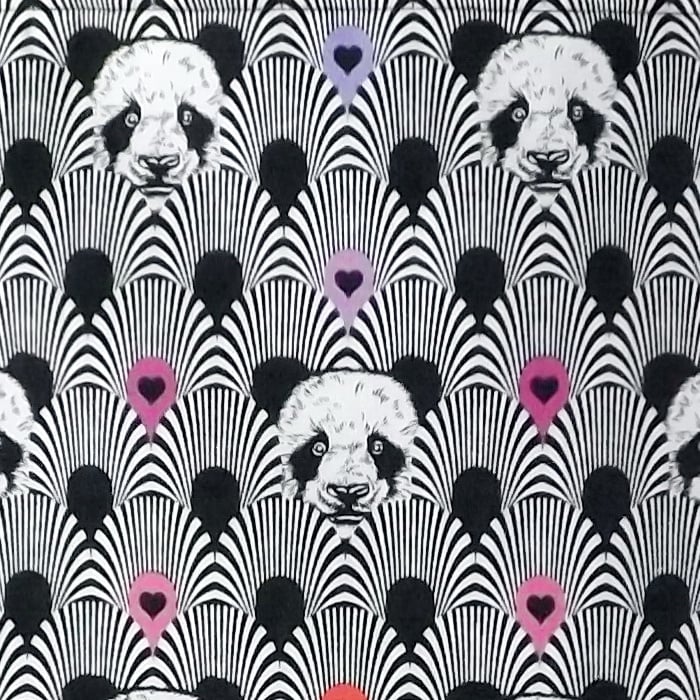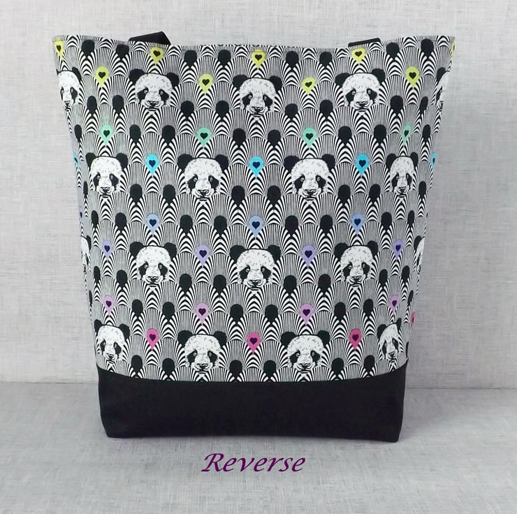 The main fabric is by Tula Pink and has a monochrome geometric design with Panda heads and small drops of colour added throughout the design in various colours, combined with a black cotton drill. It is lined in a co-ordinating fabric from the same range by Tula Pink,