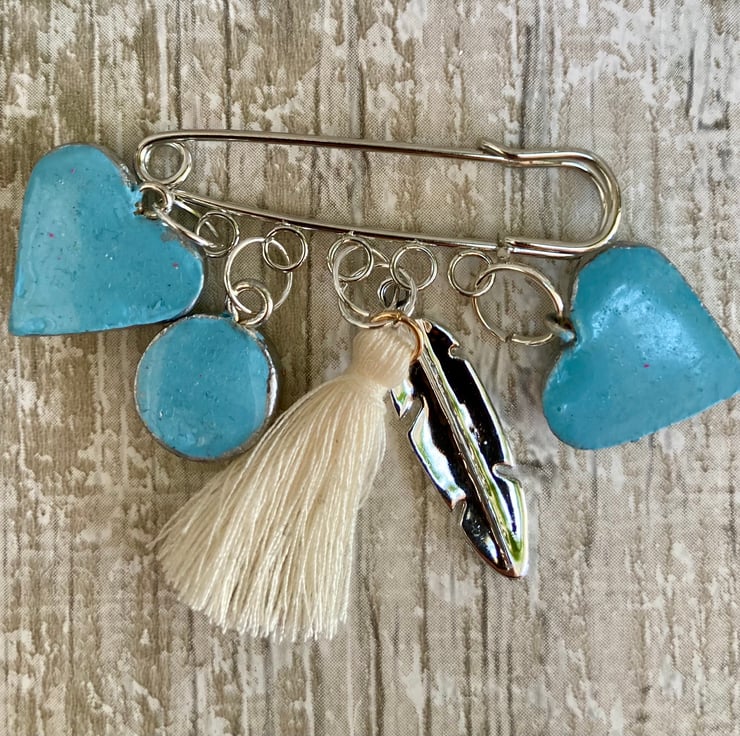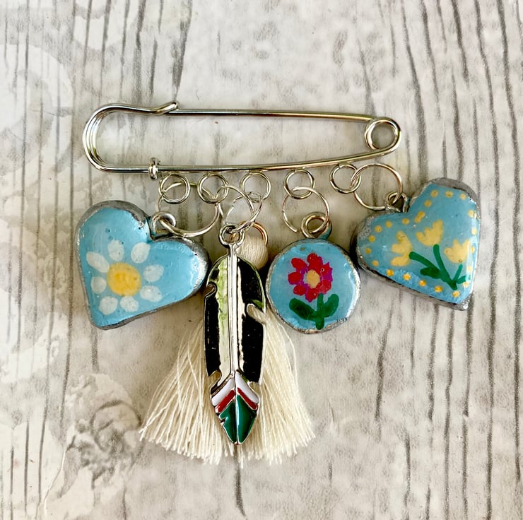 Handmade Boho Clay Charm Kilt Pin Brooch with Blue Floral Clay Charms