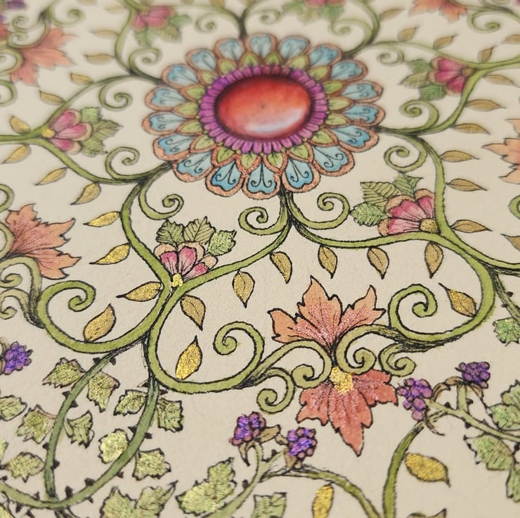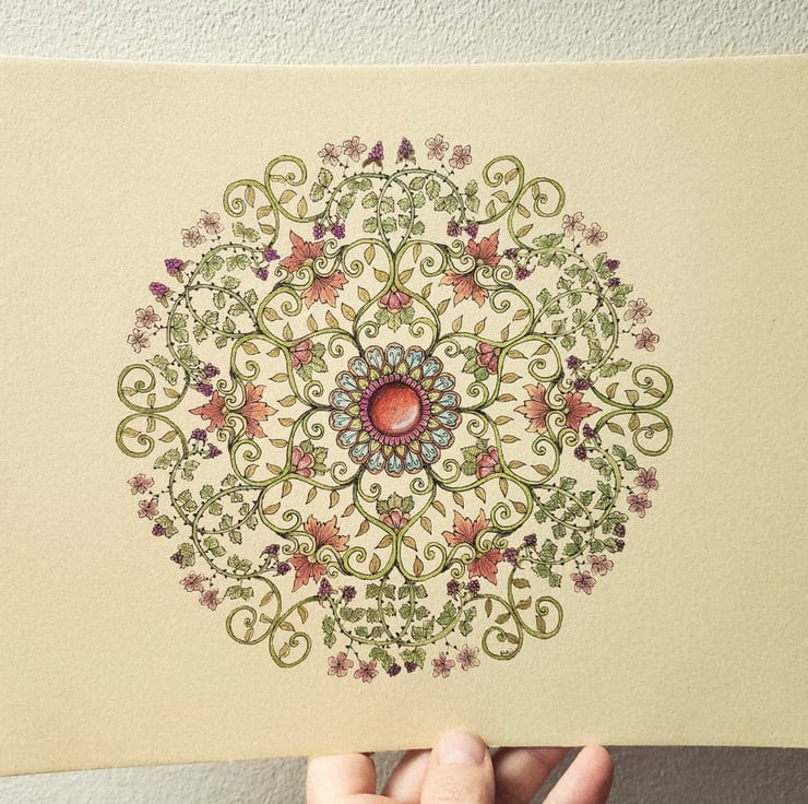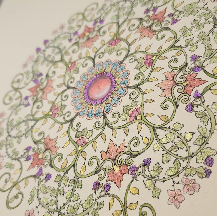 Drawn in archival black ink and painted with a variety of plain and sparkling iridescent watercolours, this mandala has a flowery, leafy theme, with swirling vines and petals extending out to twirling bramble bushes with blossoms and blackberries at the outer edge. The central gemstone is made with Prismacolor Premier pencils.