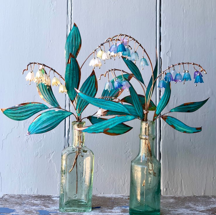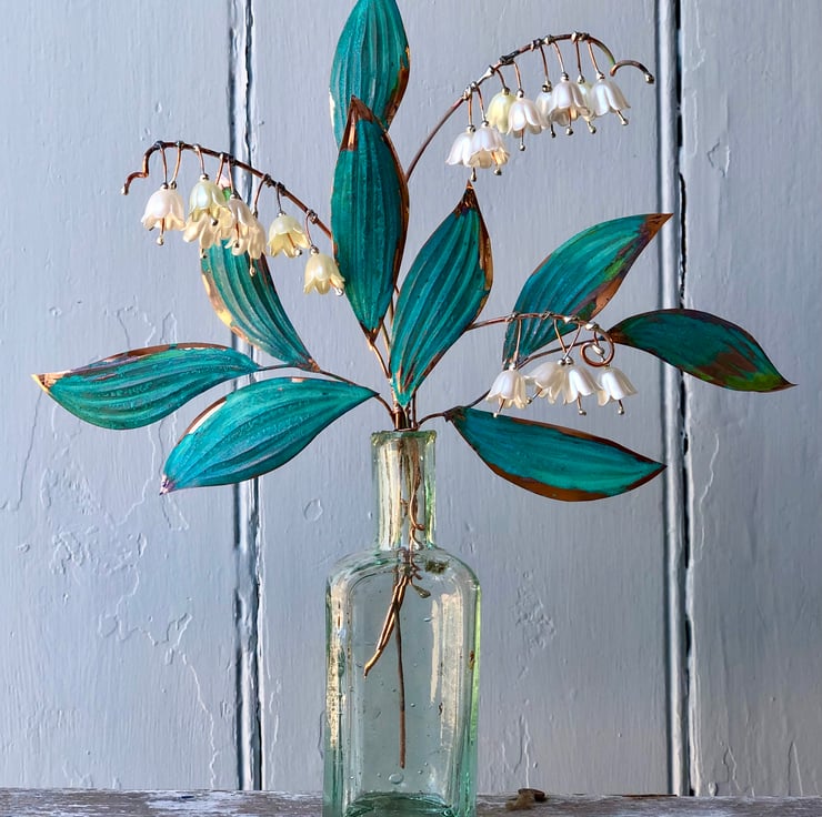 Sprigs of lily of the valley soldered with copper wires using pearlescent flowers, sit with embossed copper leaves that have been patinated with a crystaline verdigris. They are arranged into an original vintage glass bottle. It is 180mm tall and comes in a gift box with signed certificate.