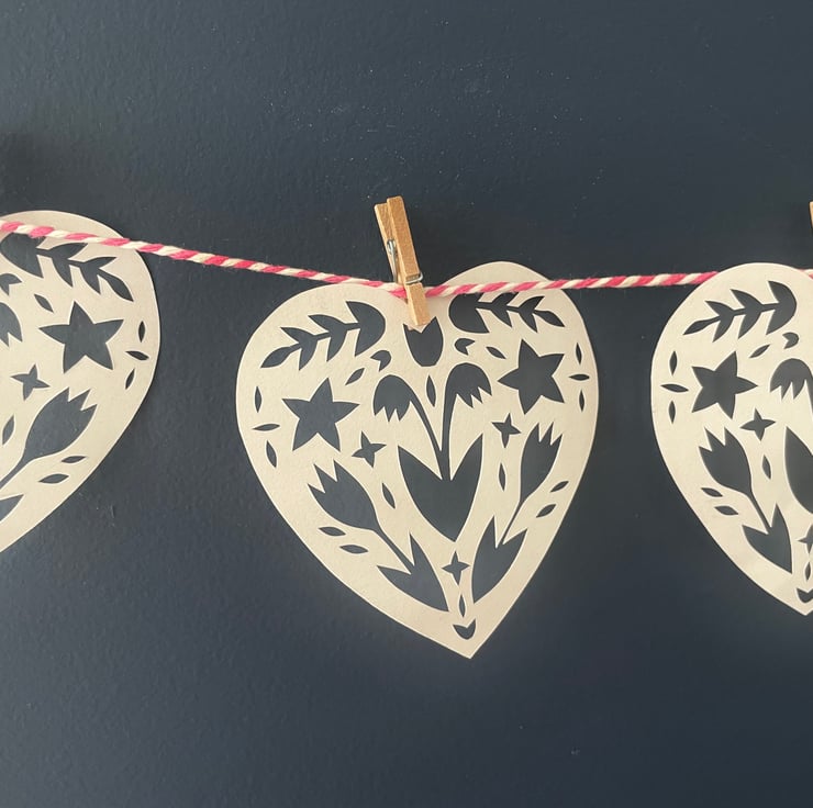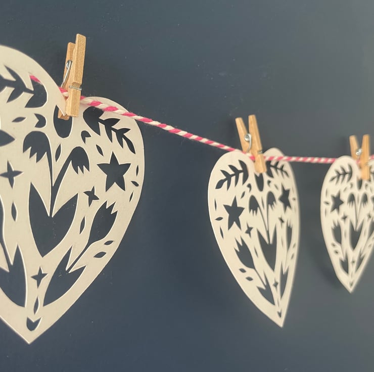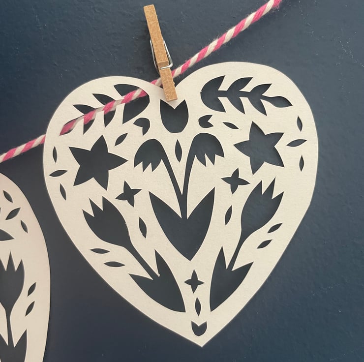 A perfectly pretty garland for a wedding. This garland is made up of six papercut hearts with a floral design, very carefully cut out by hand using a scalpel so each heart is unique. The hearts are attached to a length of pink and white striped string using mini clothes pegs.