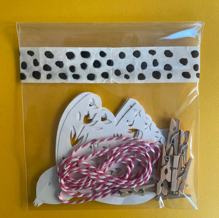 The garland comes in a cellophane envelope containing six hearts (or more if requested), a 1.20m length of string and eight mini clothes pegs (it's always good to have a couple of spare ones just in case!) If you request more hearts an extra 20cm of string and additional pegs will be included accordingly. The last photo shows an example of packaging from my bird garland.